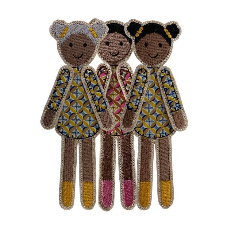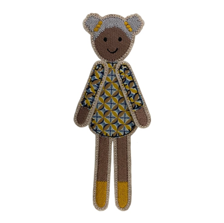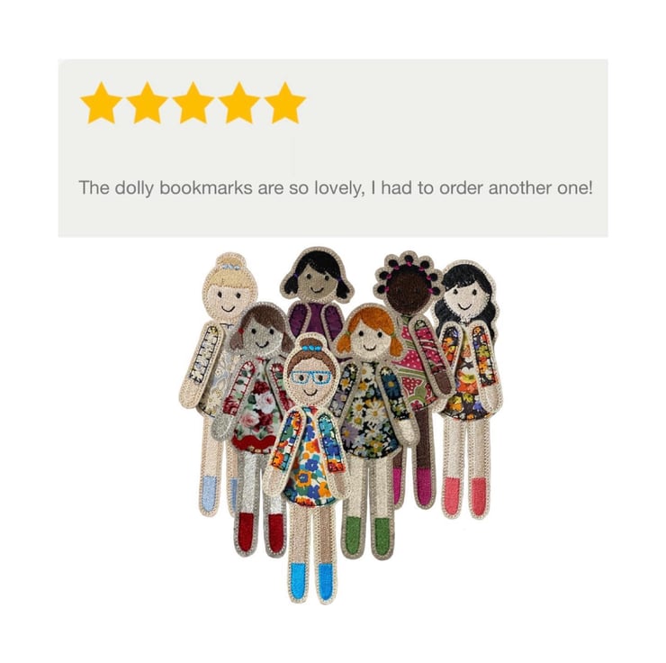 Dolly is a pretty bookmark which peeks over the page in her striking Liberty print dress. Dolly has a main body which sits behind the page with her arms and head peeking over the top. She is stitched using embroidery thread and a Cotton abstract print on a base of Wool felt.