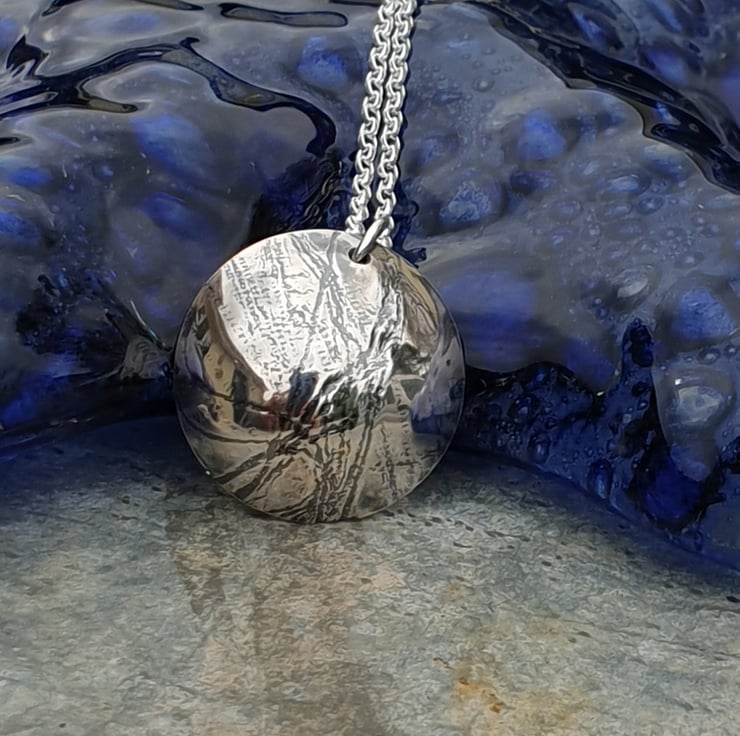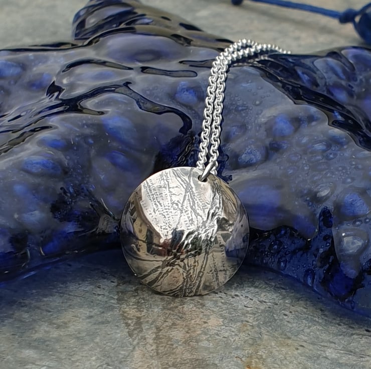 This pretty circular shaped pendant is cut from 0.8mm sterling silver which has been domed and textured using dried seaweed found on West Runton beach in Norfolk. It has been oxidised to highlight the patterns and texture.