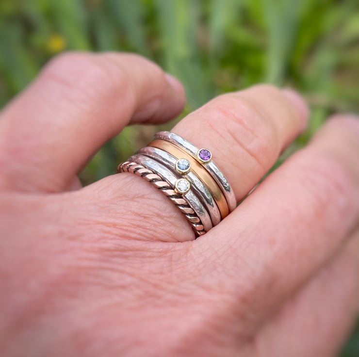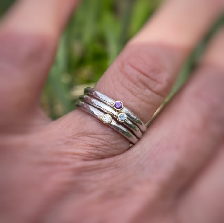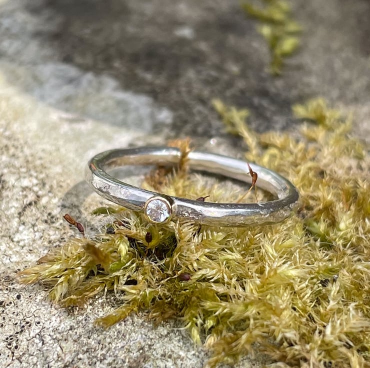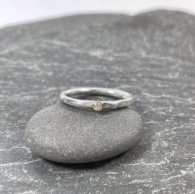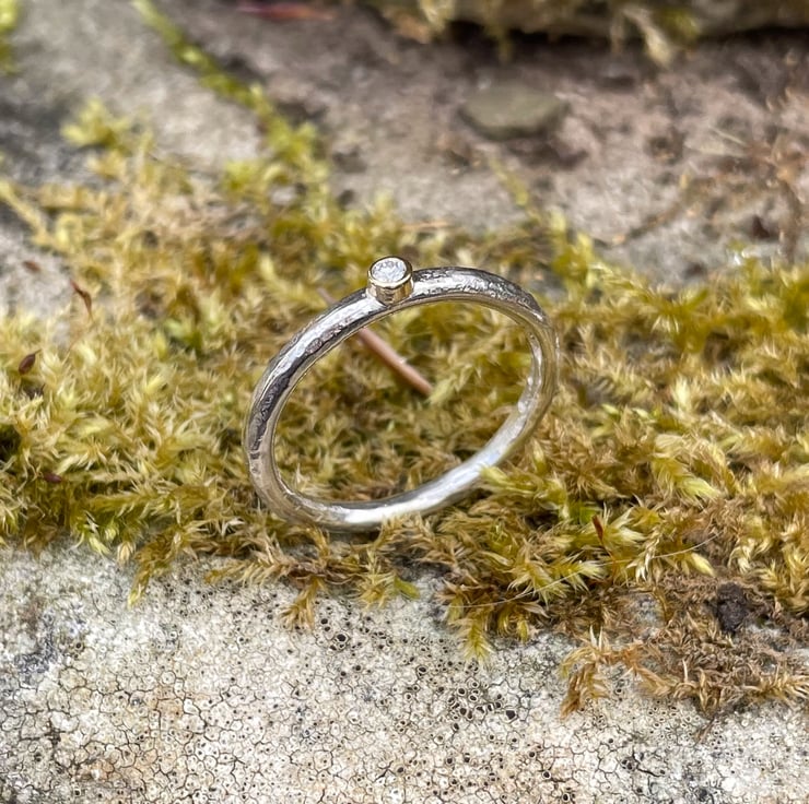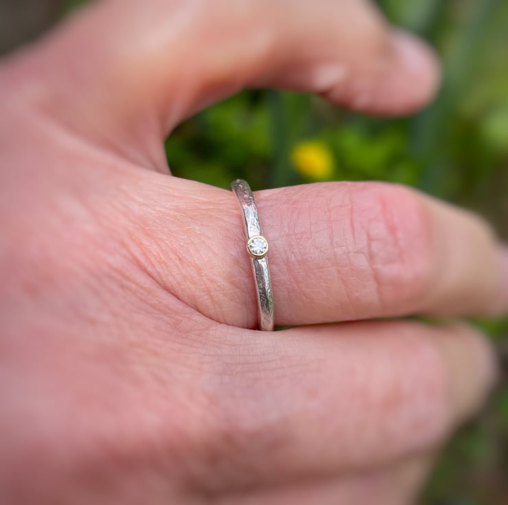 The ring shank has a round profile, it has a beaten hammered texture and a polished finish. it measures just 2mm, so room to stack quite a few comfortably should you wish. It has a 2mm diamond set in a simple 18ct yellow gold rub over setting.