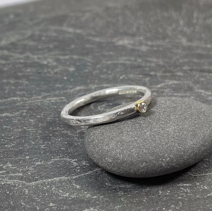A slim silver ring set with a sparkling diamond in 18ct gold.