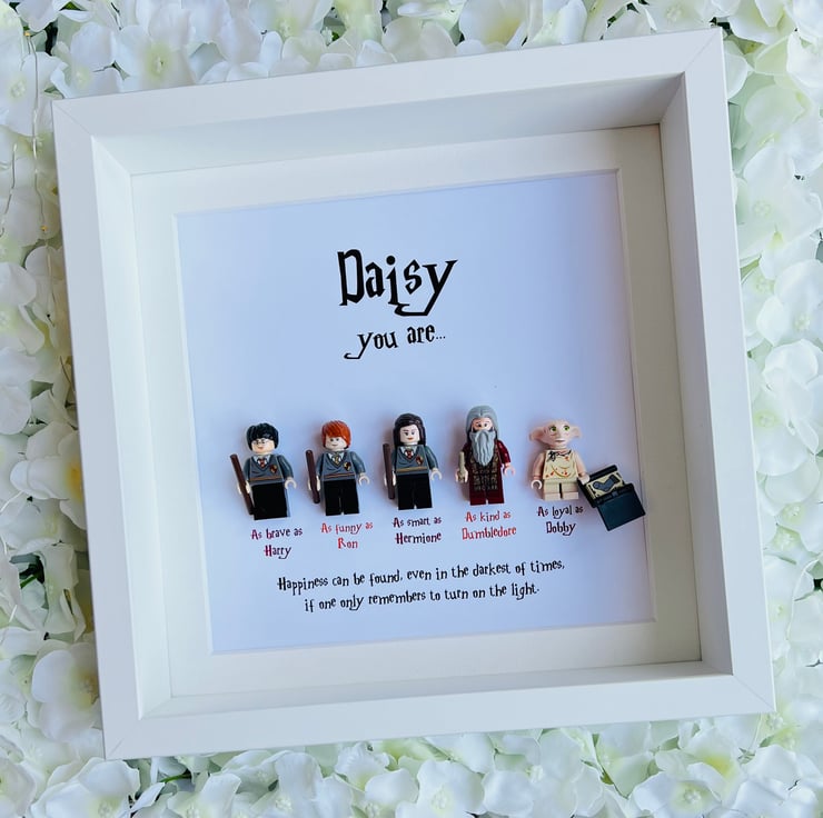 Each frame includes 5 minifigures and you can change the recipient name plus add up to two lines of your own text to the bottom to make this a truly personal gift.