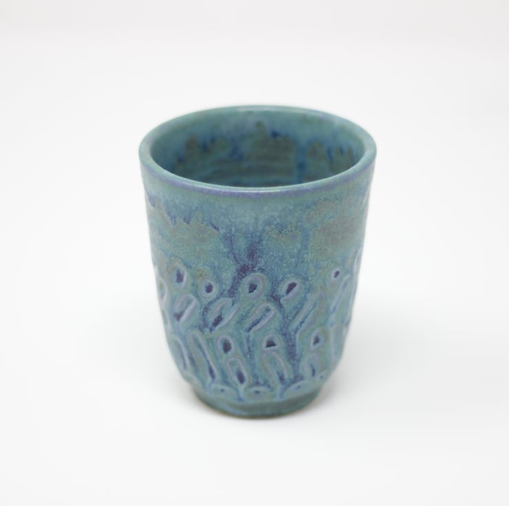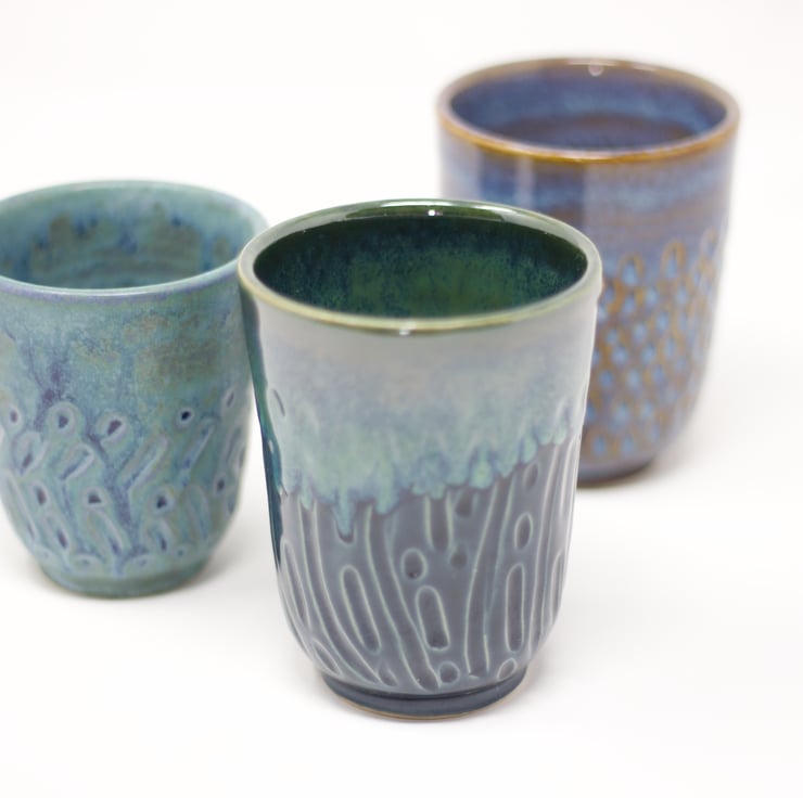 Just love drinking my coffee out of a tumbler so thought I'd make a few! I've carved into this cup and this matt finish glaze brings out different colours over the pattern. Fired to c1230 degrees (stoneware temperature) and this makes the cup more durable.