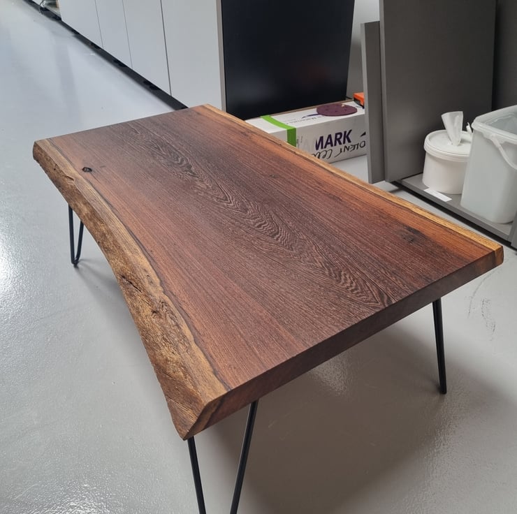 African panga panga coffee table with hair pin legs. Finished with a food safe rubio monocoat 2 plus 2c. Absolutely stunning grain pattern with a dark brown colour too the hardwood. The sizing is 900mm x 650mm 350mm high. Option's for taller hair pin legs available at a add cost.