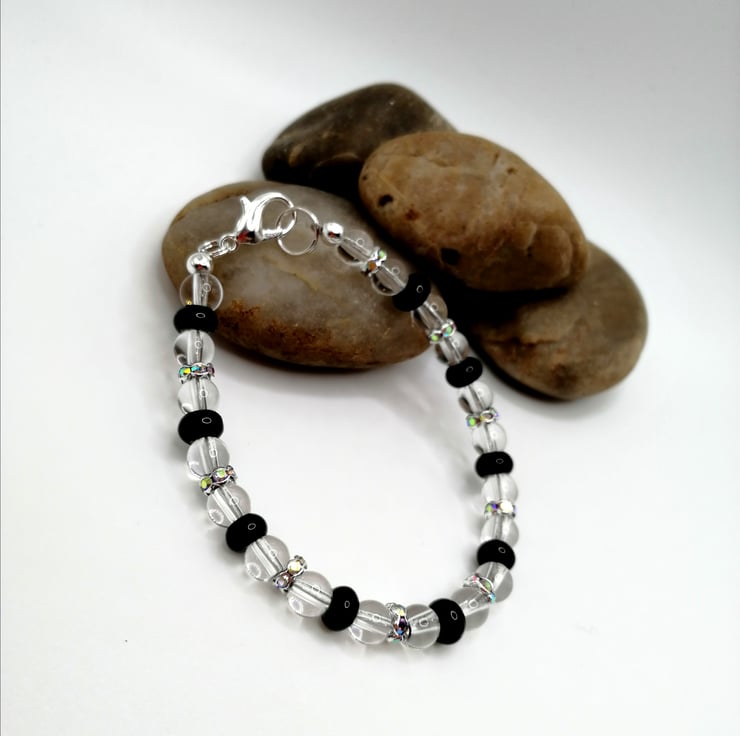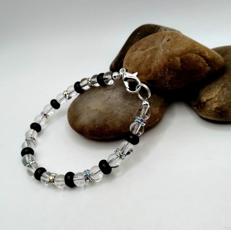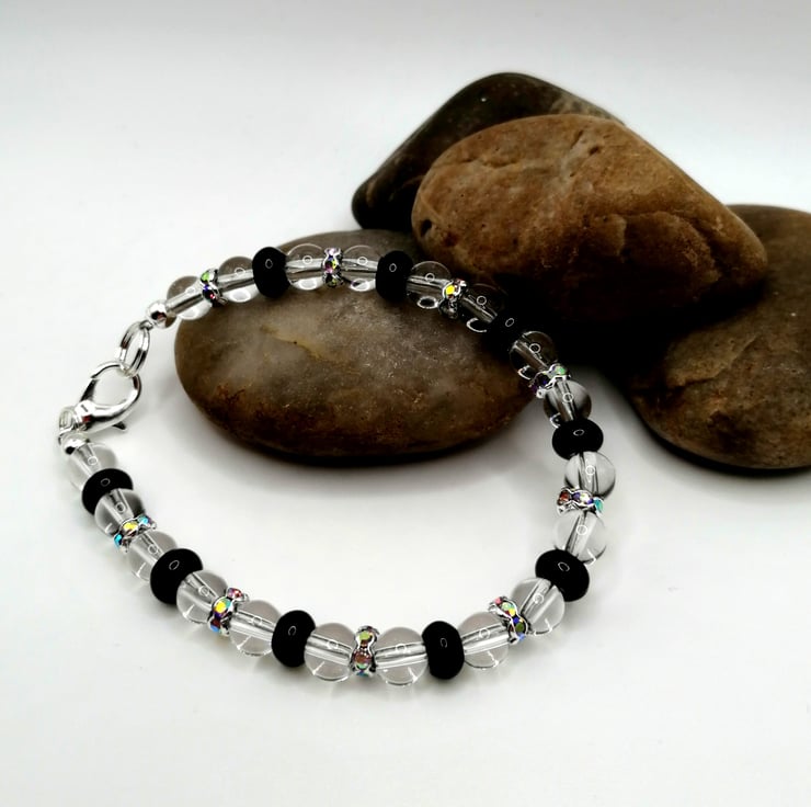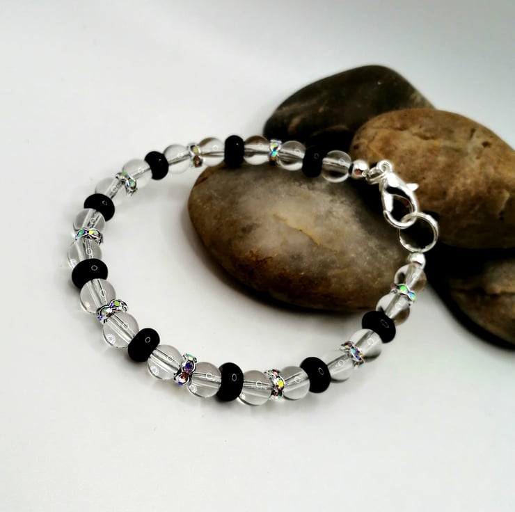 This lovely bracelet is made from clear quartz and agate beads. The spacers are silver plated and the glass rhinestones are multicoloured. Please leave me a message with your choice of length. If I don't receive a message I will send as pictured.