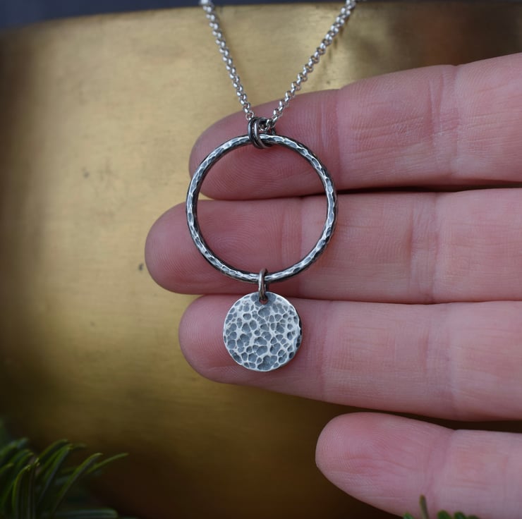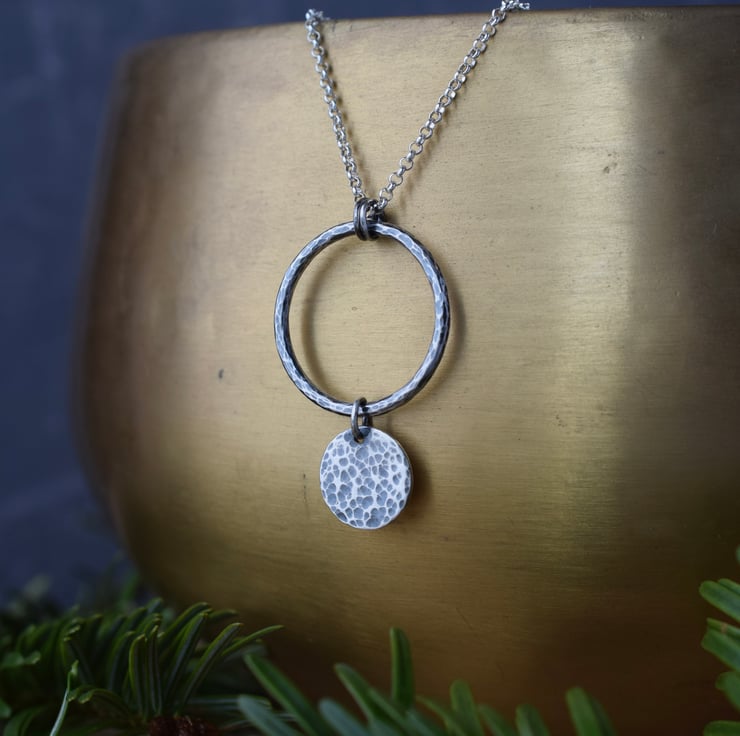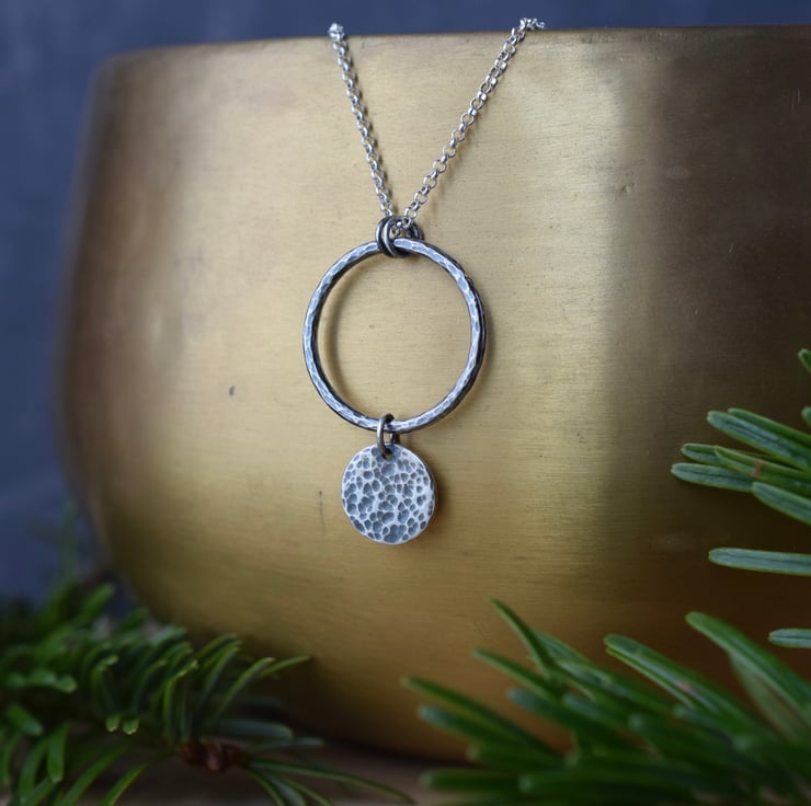 Textured sterling silver pendant featuring a hammered open circle with disc charm. The piece has been oxidised to give a darkened, aged finish to the silver.
