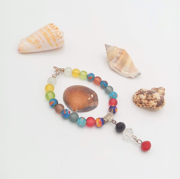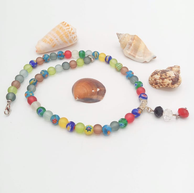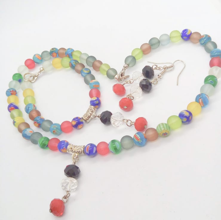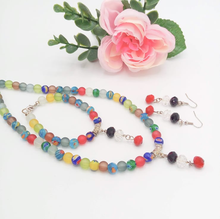 This very attractive jewellery set is made using 8 mm multi coloured millefiori beads and 8 mm multi coloured dusky glass beads with a centre drop comprised of a red, clear and black crystal rondelle beads in the centre of the necklace and bracelet. Both the Necklace and the Bracelet have a silver plated lobster clasp and the earrings have silver plated ear wires.