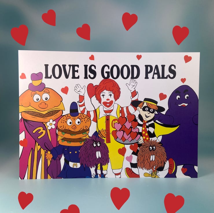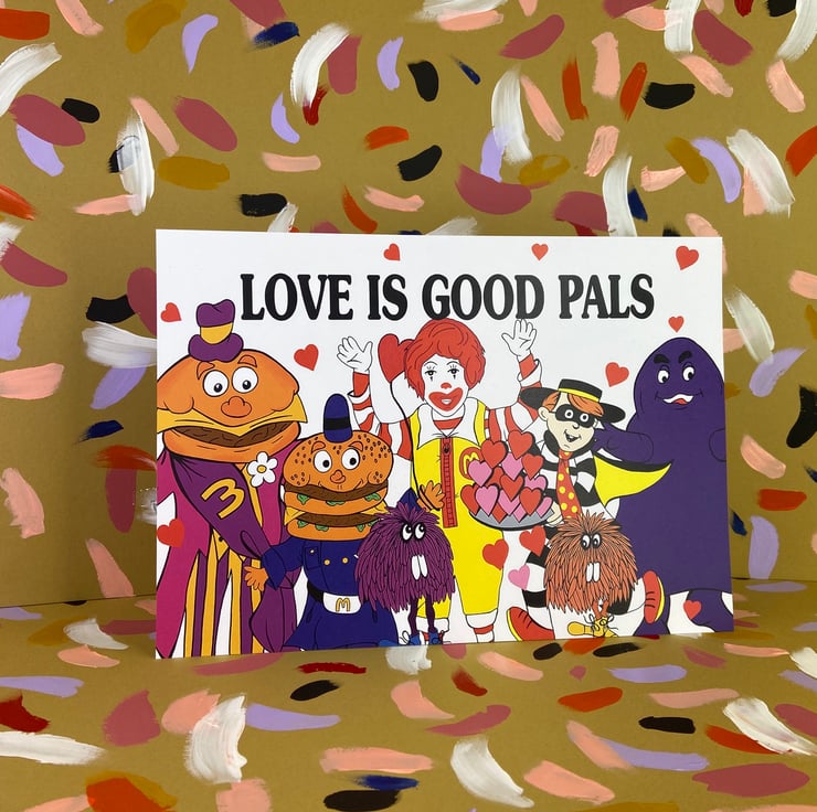 Colourful illustration of vintage Ronald McDonald and all his McDonalds's friends.