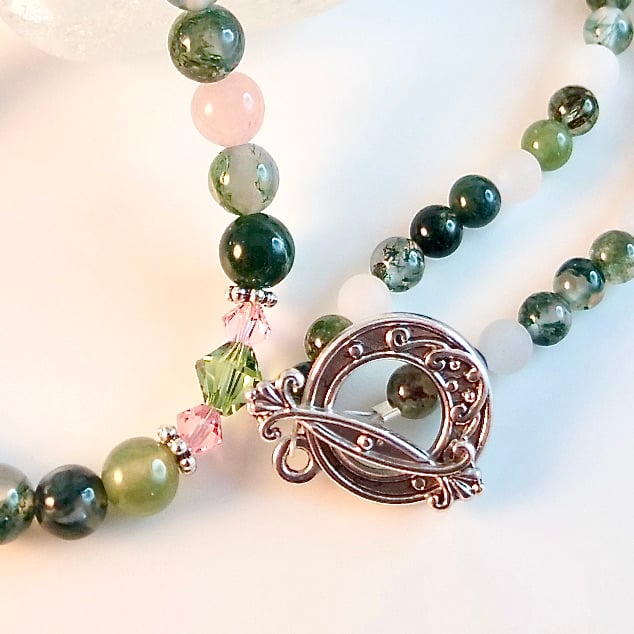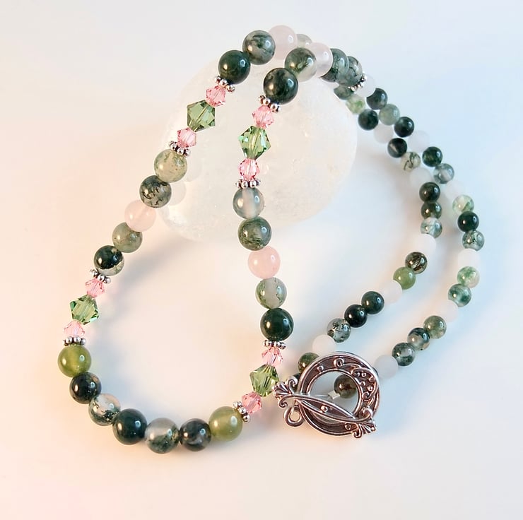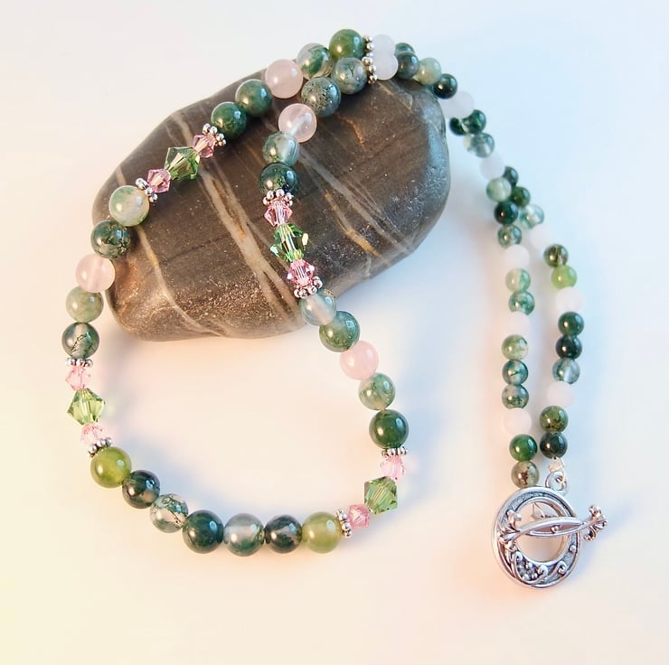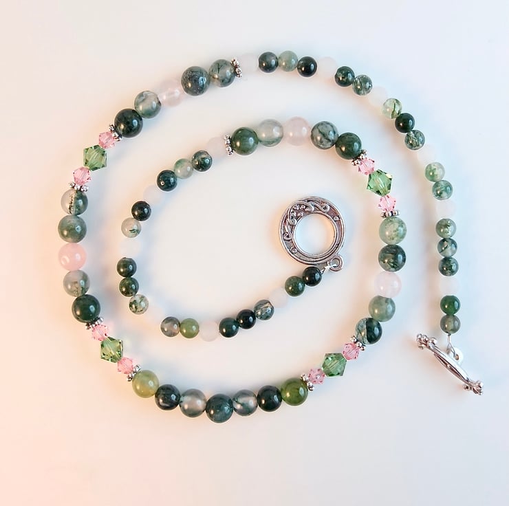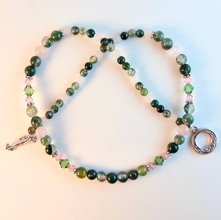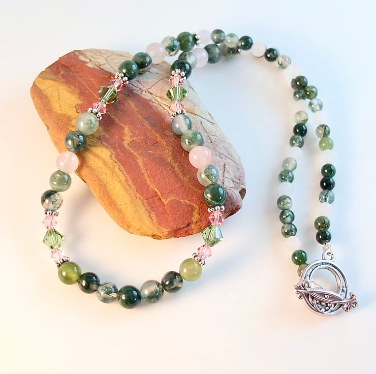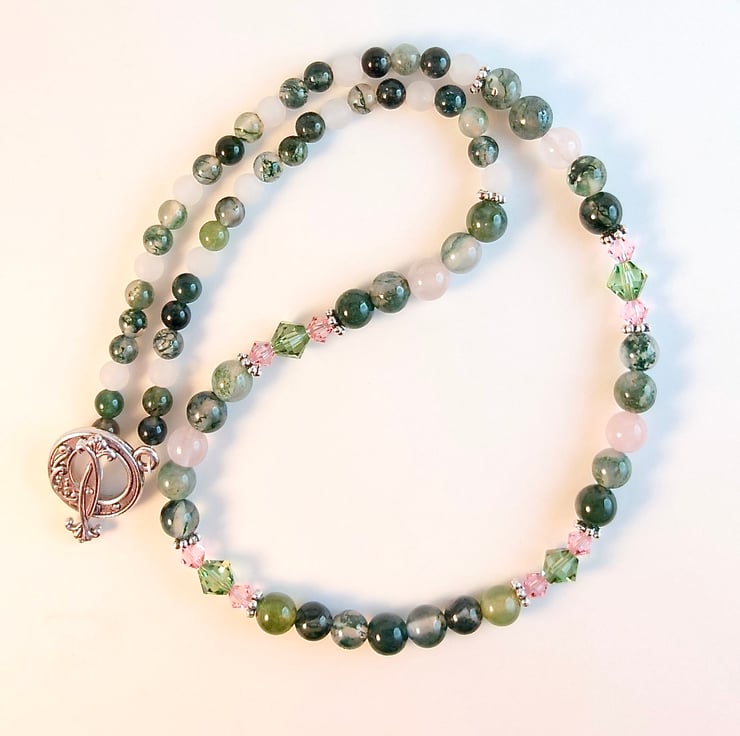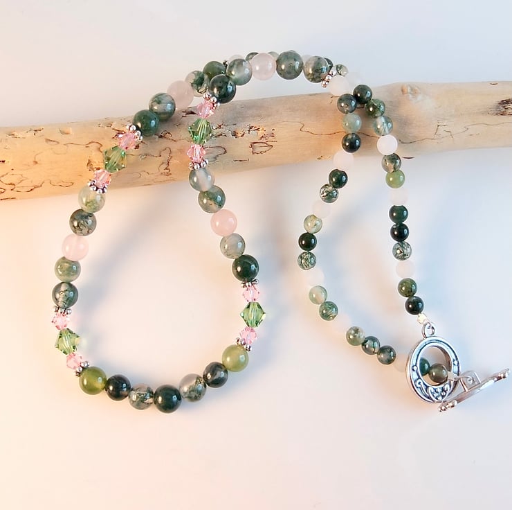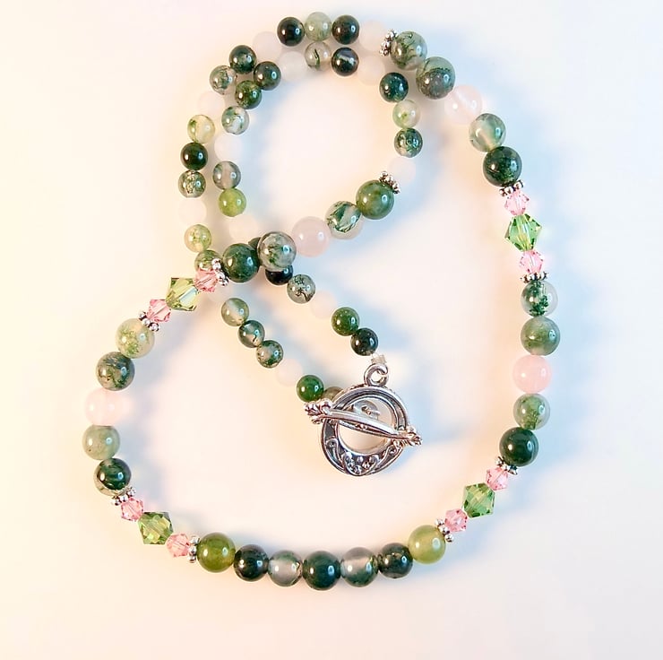 Pretty, sparkly necklace of 6mm and 4mm Moss Agate, 6mm Rose Quartz and 4mm frosted Rose Quartz beads.