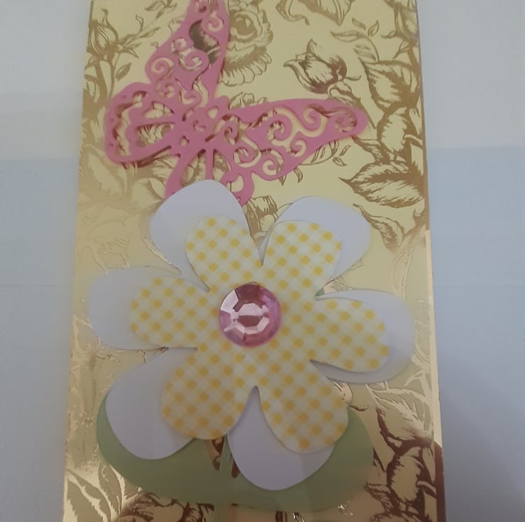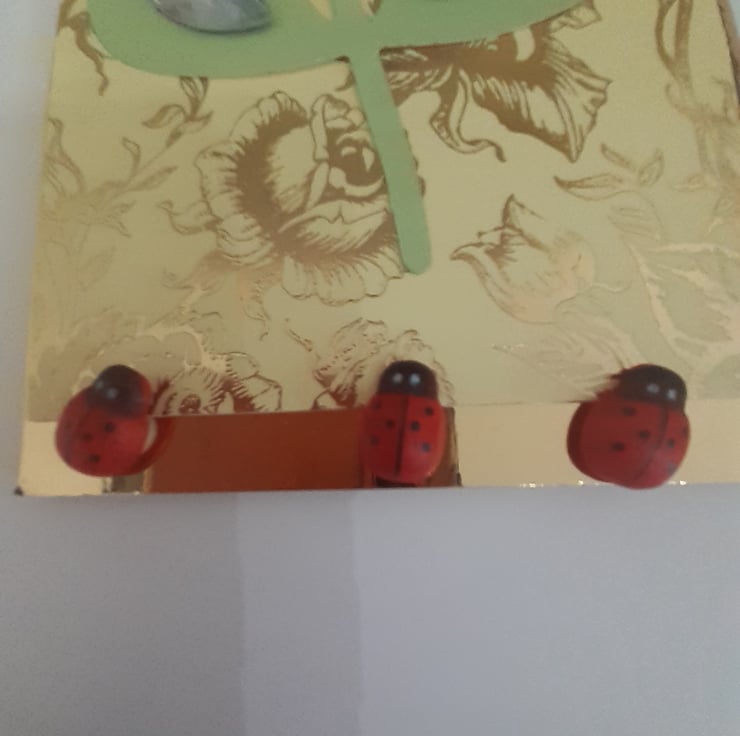 In the top left/middle of the card is a pink die cut detailed butterfly.on the very bottom of the card are three detailed ladybirds, that look like they are ready to crawl up the card.