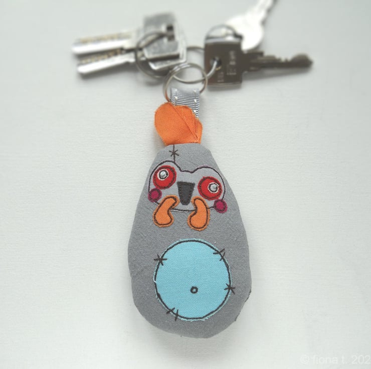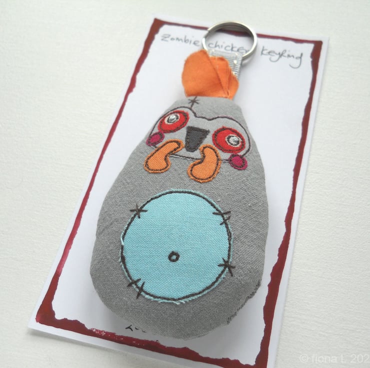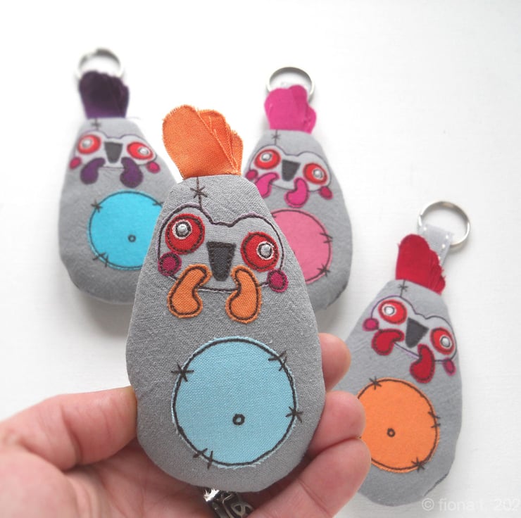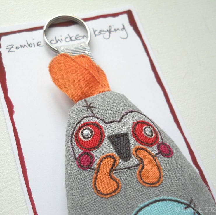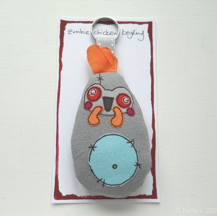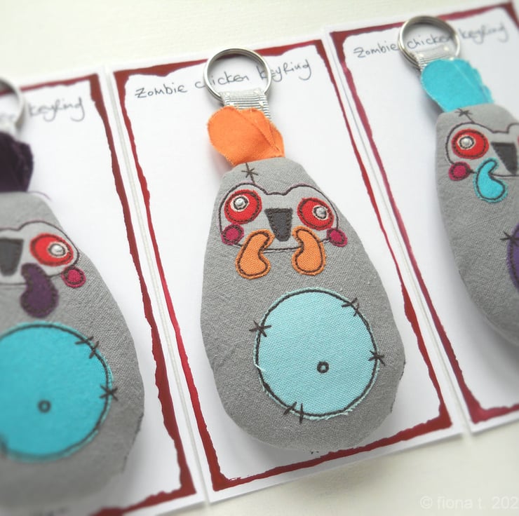 freehand embroidered zombie chicken bag charm or keyring - BLUE & ORANGE