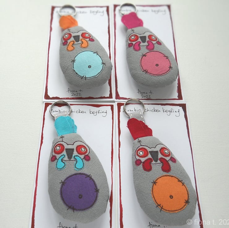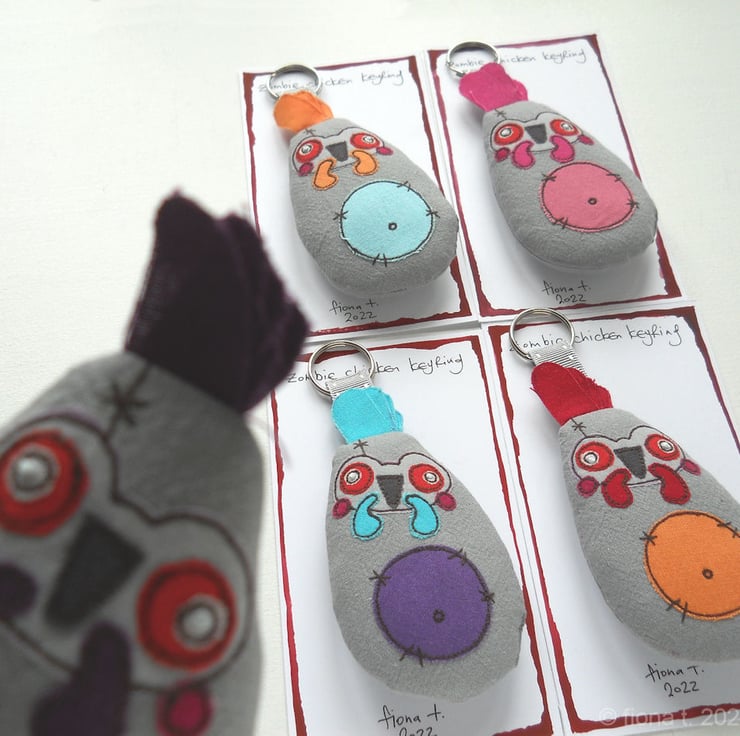 these befuddled little fabric zombie chickens measure about 10cm (4inches) tall / 14cm (5.5”) including comb, hanging loop & split ring.
