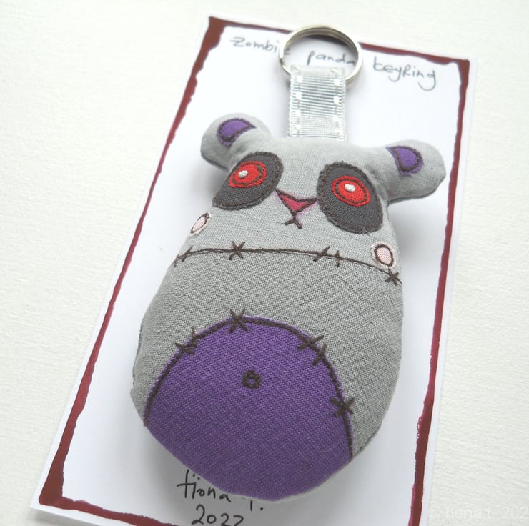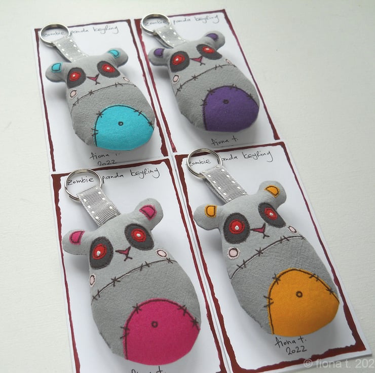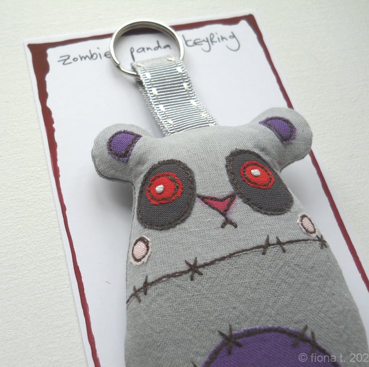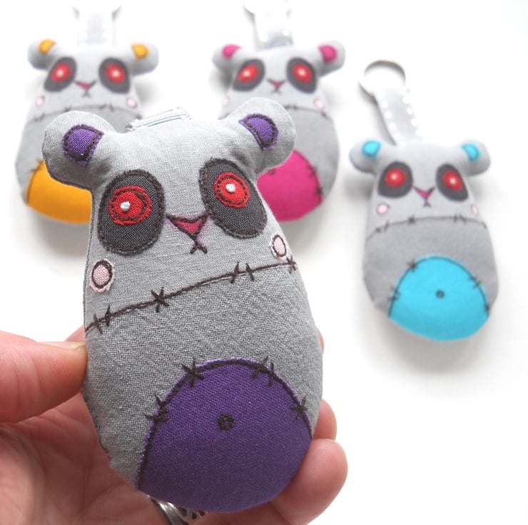 these morose little fabric zombie pandas measure about 10cm (4inches), and 13cm (5”) including hanging loop & split ring.
