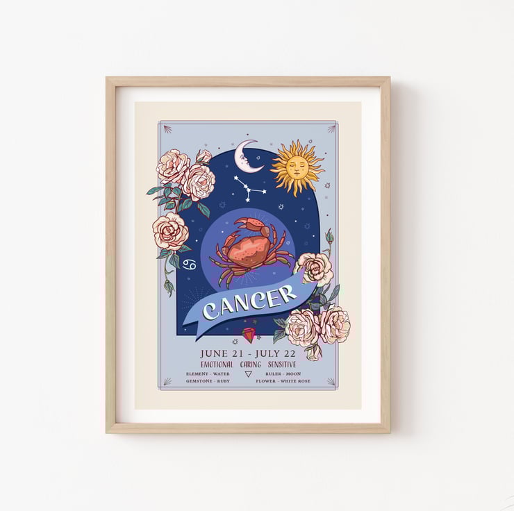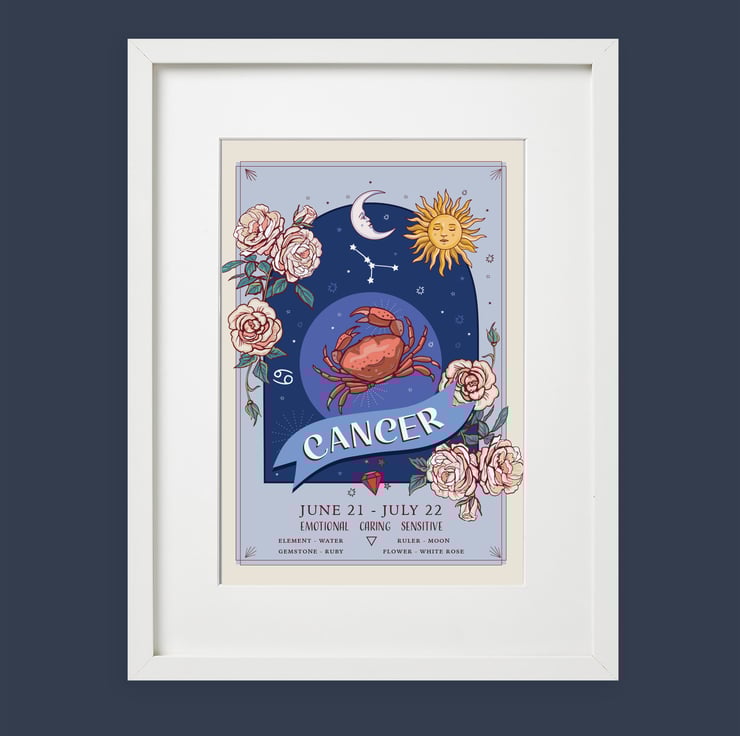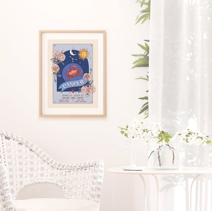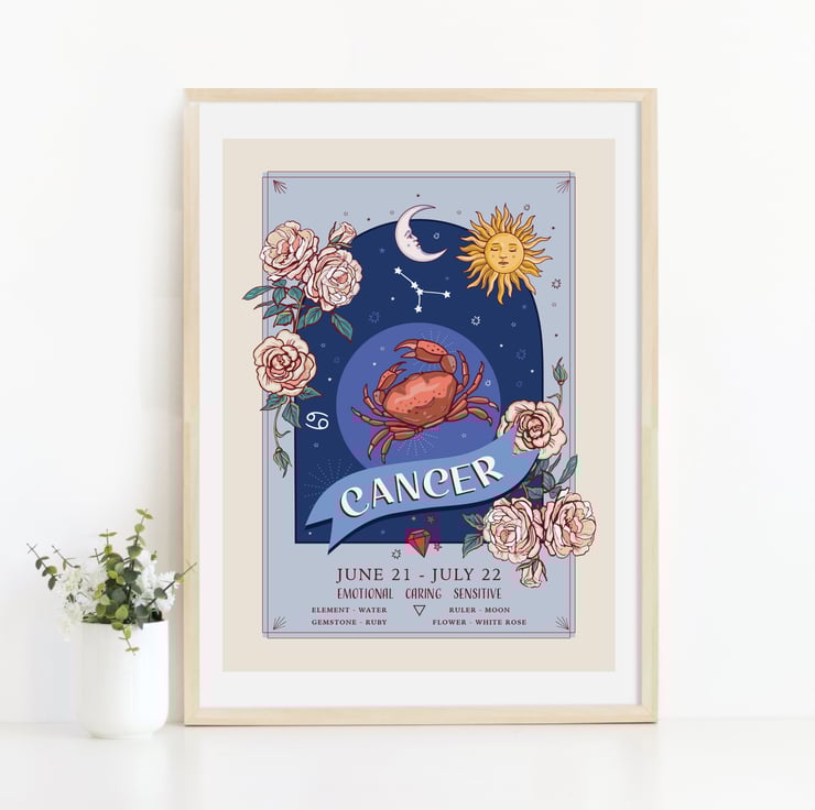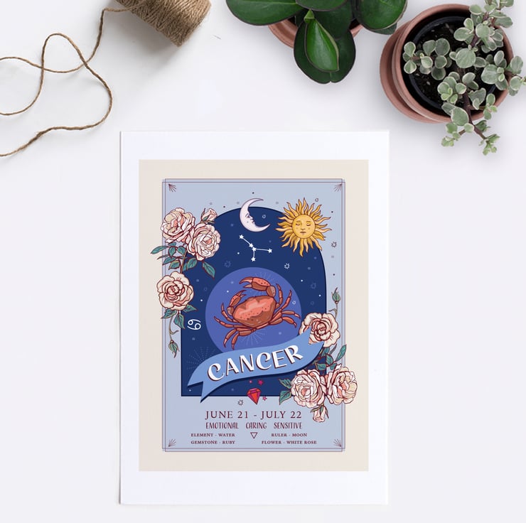 An unframed wall art print from my original illustration. Part of my 'Zodiac Signs and Flowers' collection it has lots of information about each star sign.