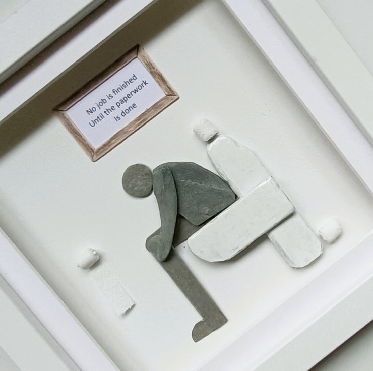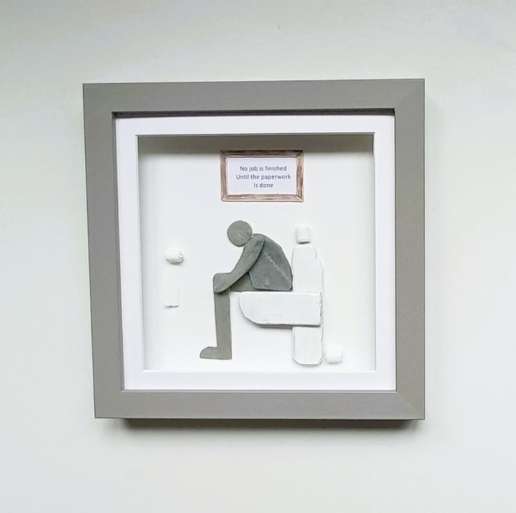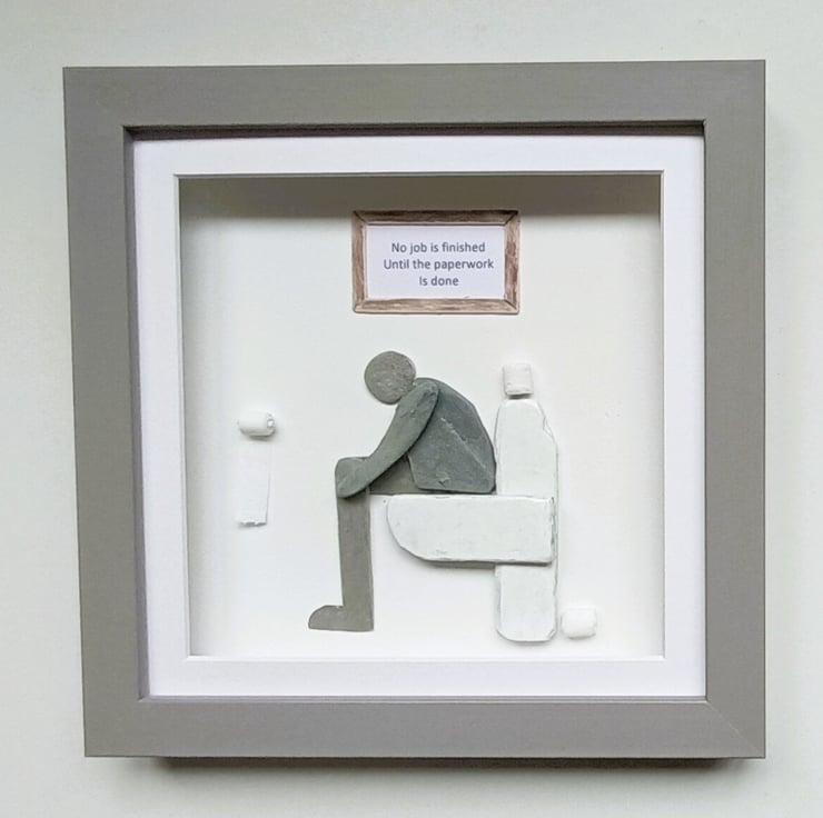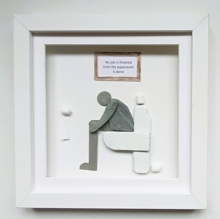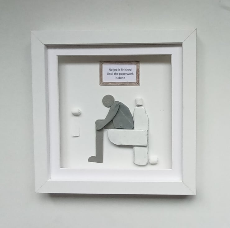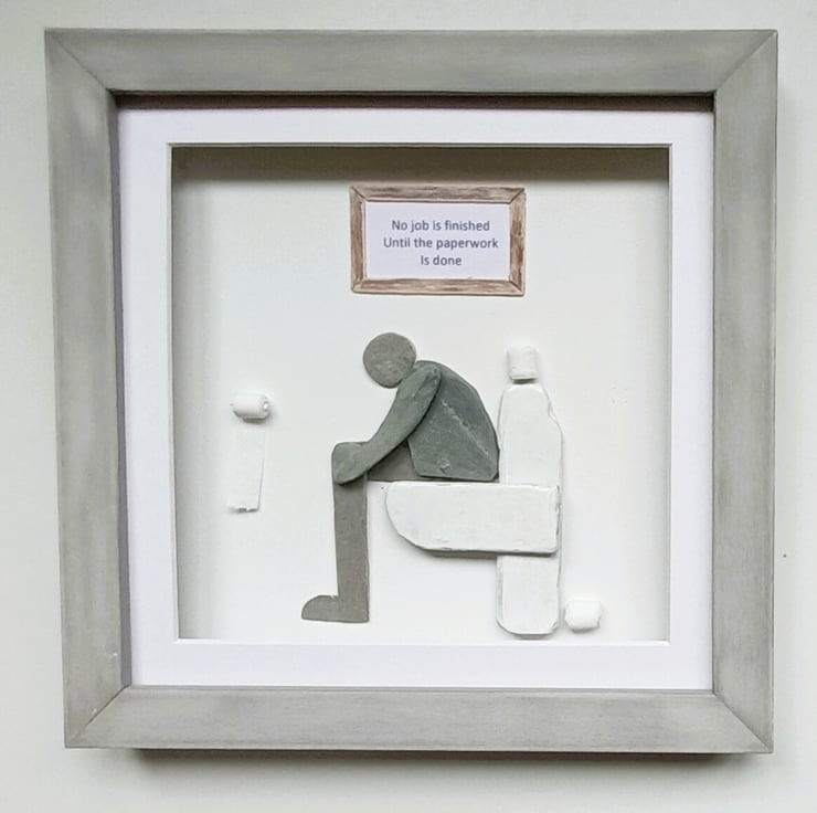 A pebble man sitting on the toilet beneath a picture bearing the phrase 'No job is finished until the paperwork is done'.