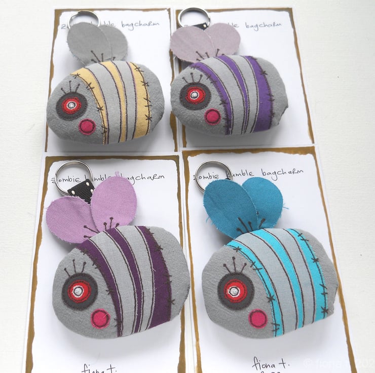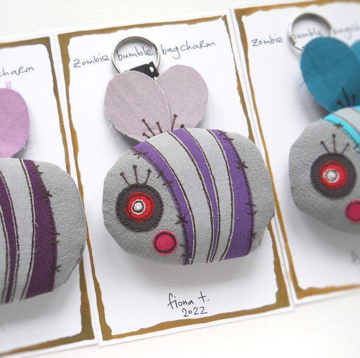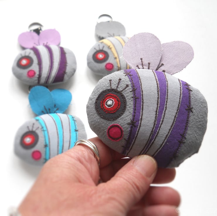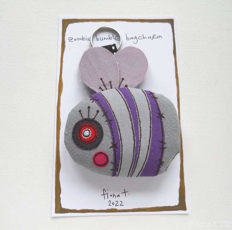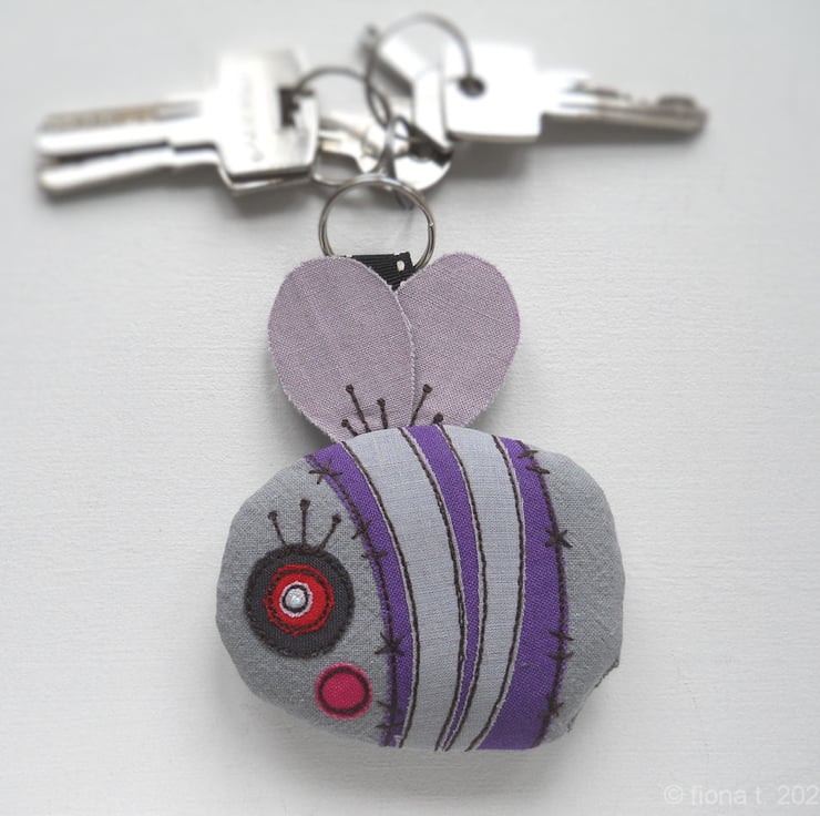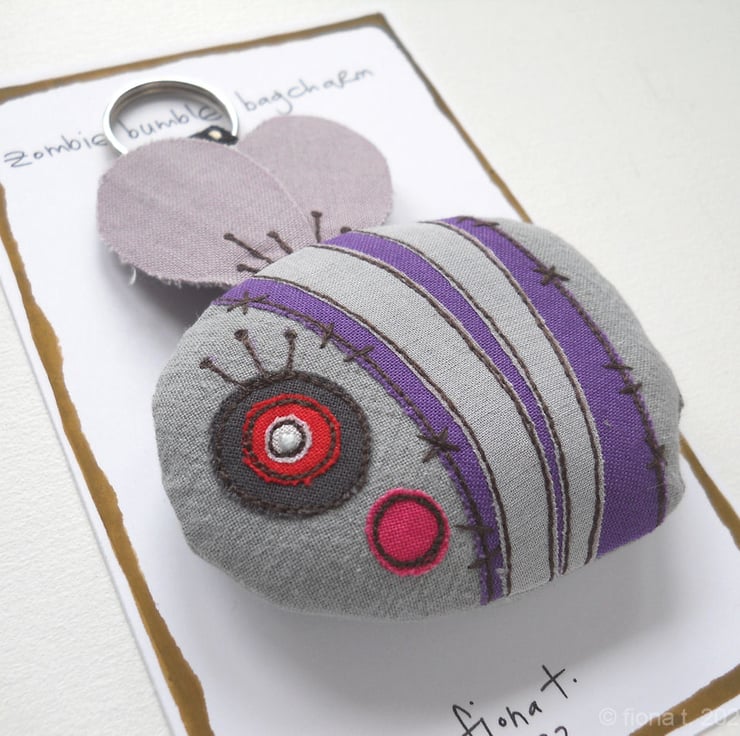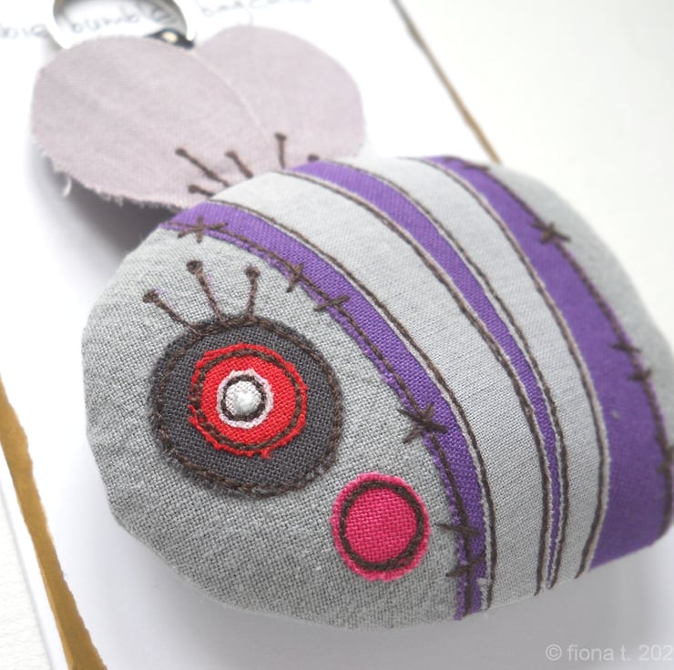 freehand embroidered zombie bumble bee bag charm or keyring - PURPLE