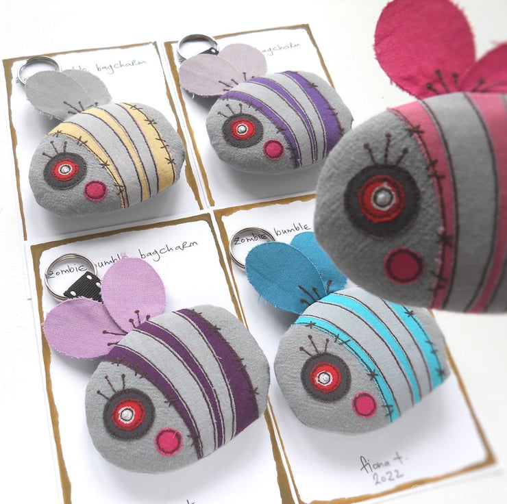 these tatty little zombie bumbles measure about 8cm (3inches) from nose to bum, and are approximately 11cm (4.5”) tall including wings, hanging loop & split ring.