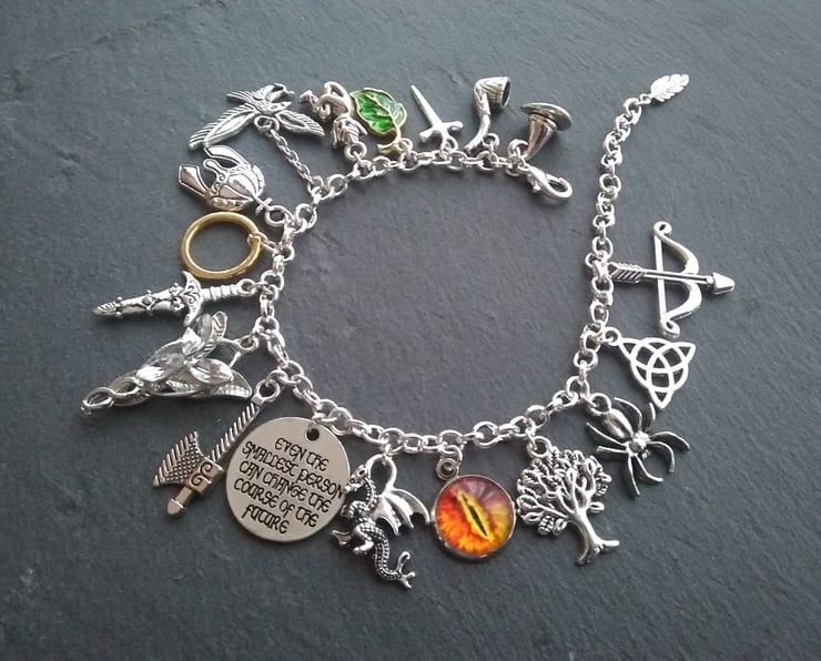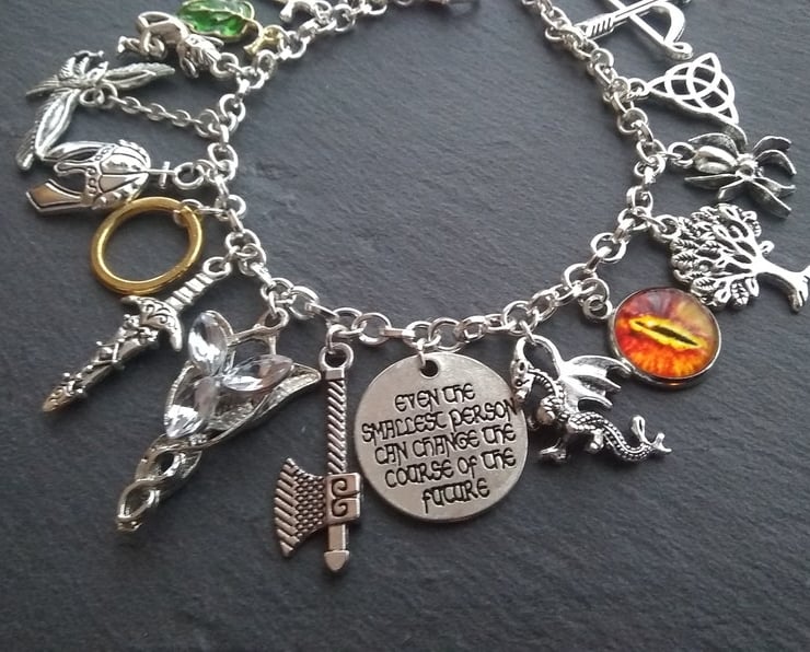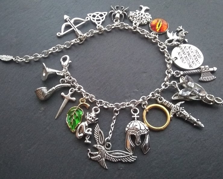 Be the ultimate fan girl with this handmade packed charm bracelet with 18 charms including characters from The Lord of the Rings & Hobbit movies. Featuring Gollum, Shelob, the Evenstar and the Eye of Gondor, this is a real collectors piece! One size fits most. Adjustable length 18cm - 21 cm (Just over 8 inches) Comes with organza gift bag.