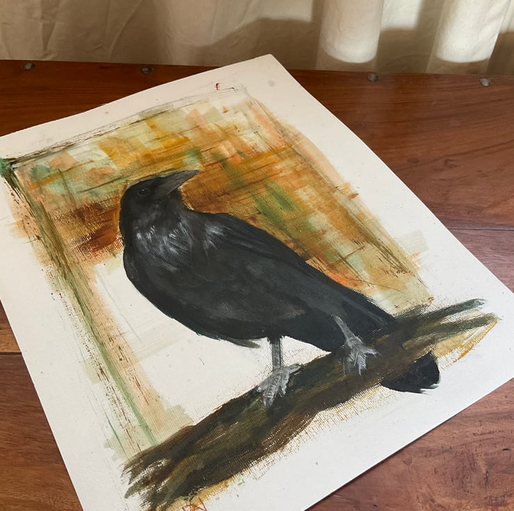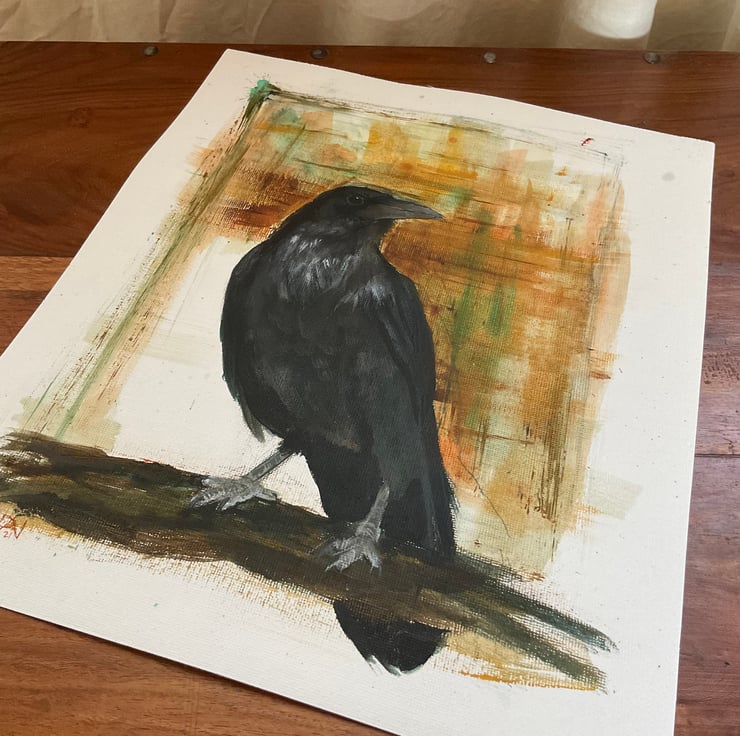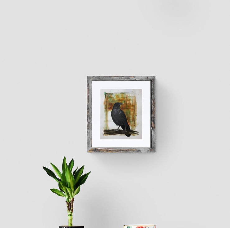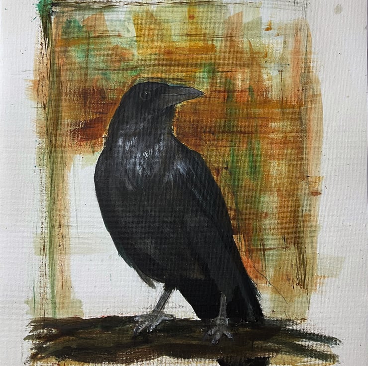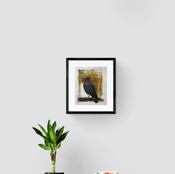 An original acrylic painting of a crow, on acrylic canvas paper. Beautiful velvety black plumage against an abstract yellow ochre, with touches of green. Looks stunning in a black frame, or perhaps a shabby grey wood frame.
