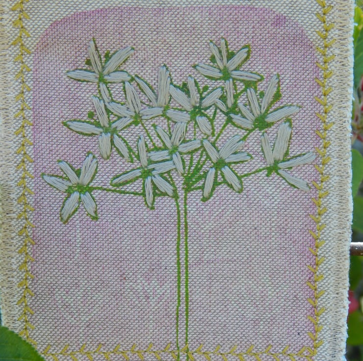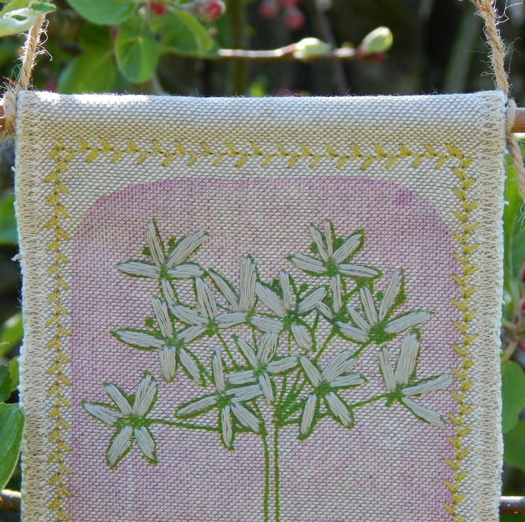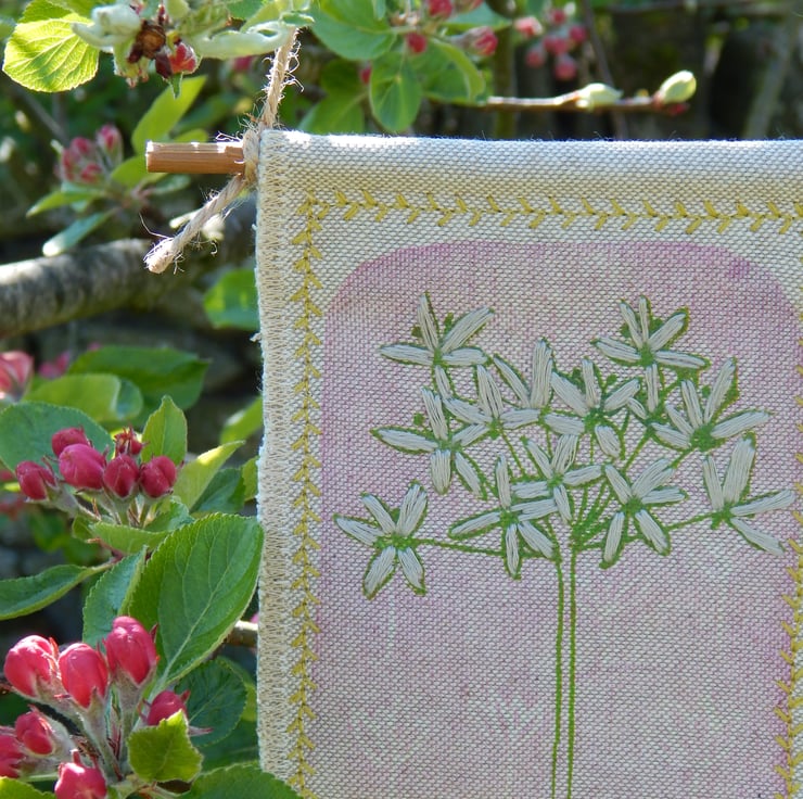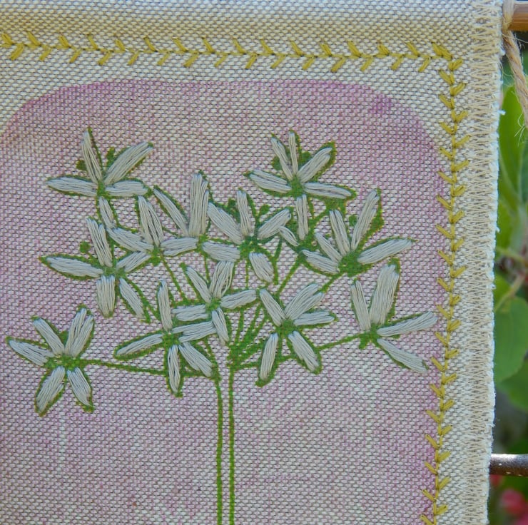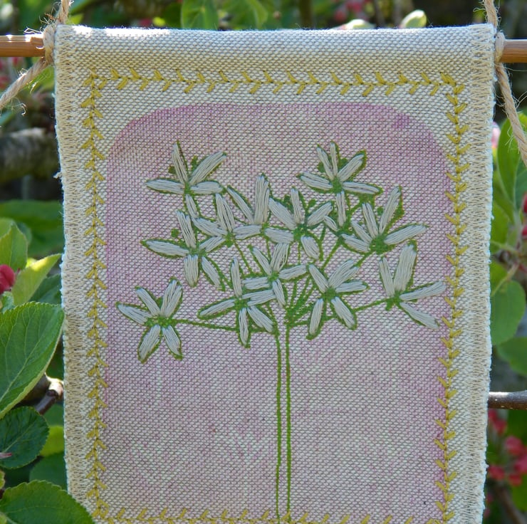 This is a screen printed wild garlic with hand embroidery, printed onto a beige cotton with a simple pink lino print background. This has a couple of layers of cotton fabric for some stability and this is sewn onto a piece of willow, a simple hanging loop is made with a piece of hemp string connected from one end of the willow to the other. It has been hand embroidered for a pop of colour.