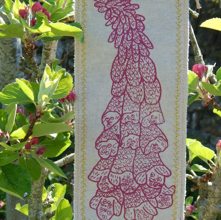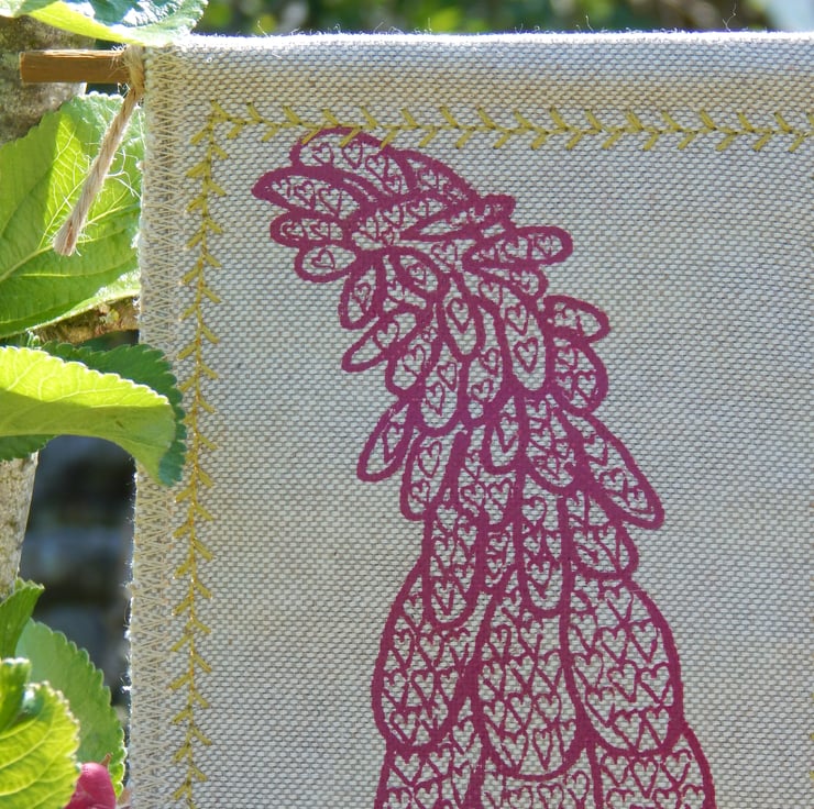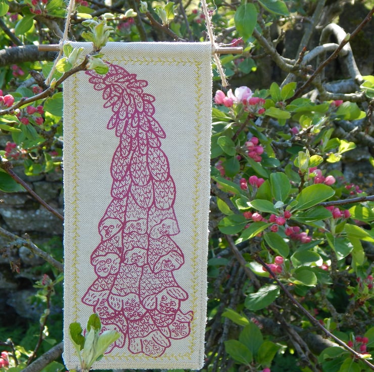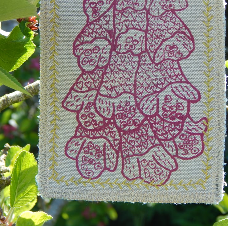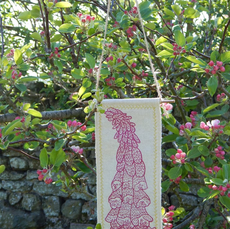 This is a screen printed magenta pink foxglove with hearts within the flowers. This has a couple of layers of cotton fabric for some stability and this is sewn onto a piece of willow, a simple hanging loop is made with a piece of hemp string connected from one end of the willow to the other. It has been hand embroidered for a pop of colour.