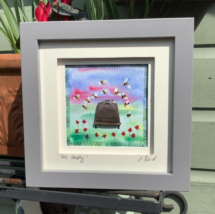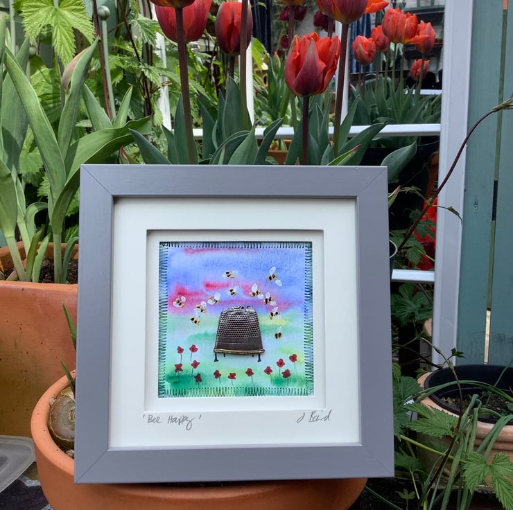 It is an original watercolour painting with a vintage thimble used to represent a beehive.
