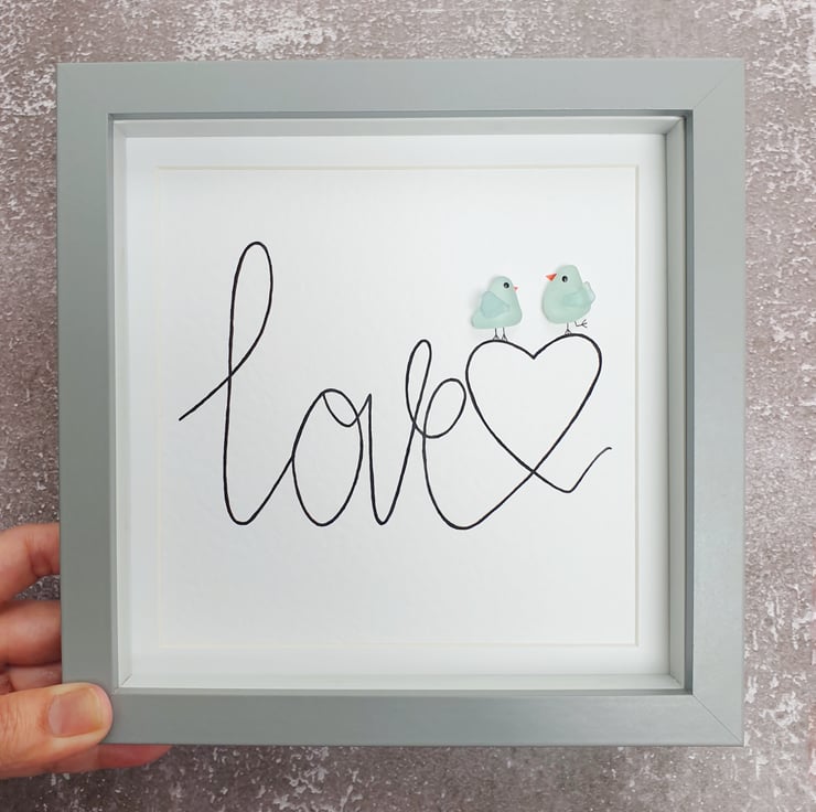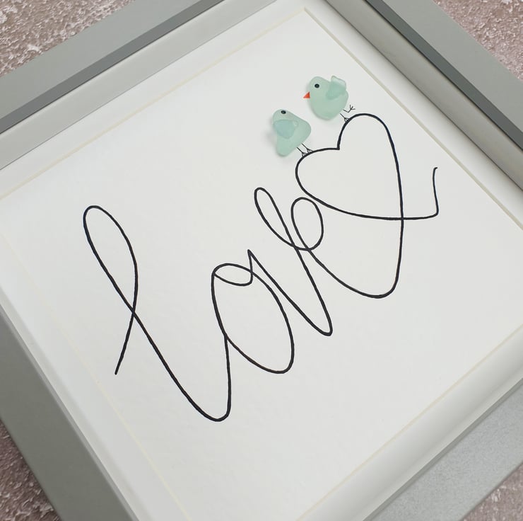 A beautiful handwritten LOVE script with pale green seaglass lovebirds on white textured card. The seaglass were personally found on the shores of England.
