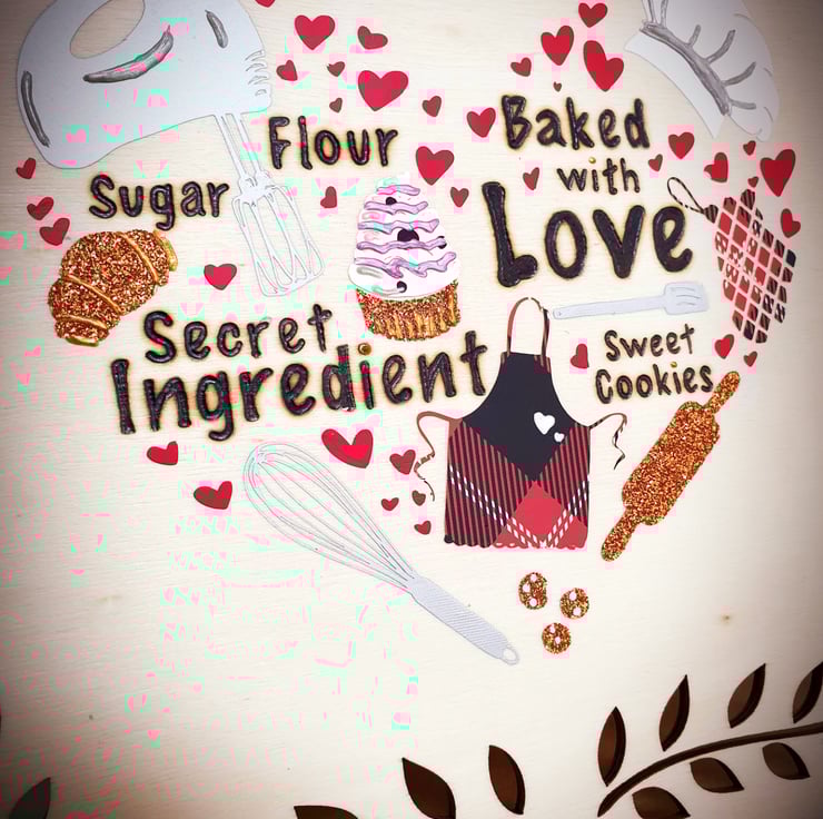 The decoration measures approximately 22 x 22 cm, with a leaf laser-cut border on top and bottom. In the middle, there is a display of a heart shaped out of baking appliances and accessories, hearts in various sizes, and wood-burned sentiments. It comes with a white-beige braded twine.