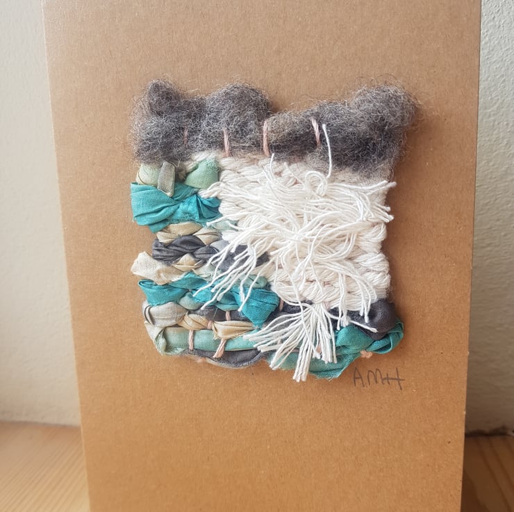 Individually designed handmade card with a 'mini' weaving that has been hand woven using natural wool fibres, pure cotton cord and recycled silk fabric, mounted on a buff card.