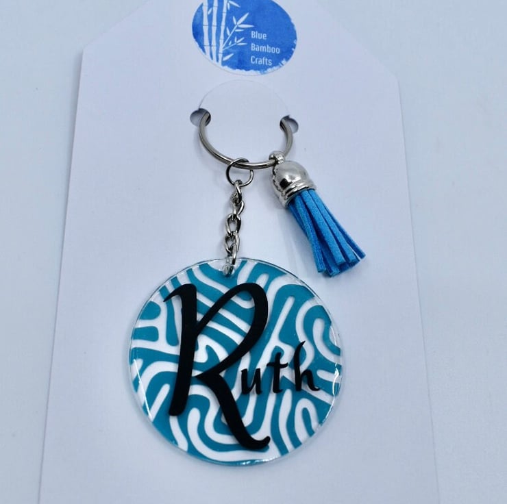 These keyrings are made from a durable acrylic with permanent vinyl applied for the pattern and name. Large range of colours and patterns available.