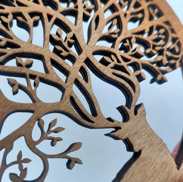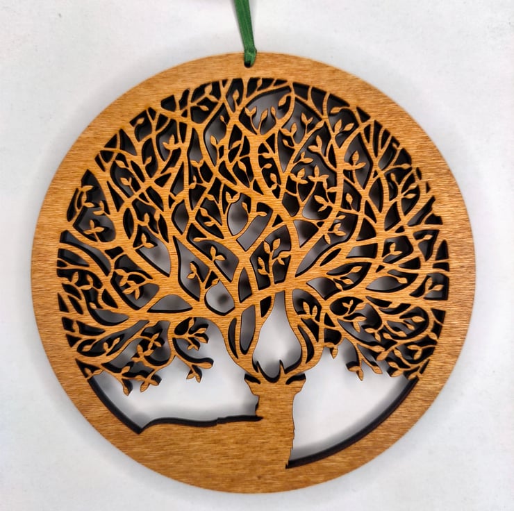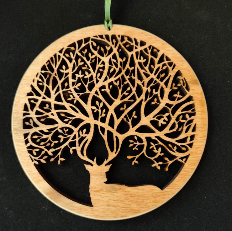 The ornament is laser cut and hand-finished from a single piece of hardwood poplar ply.