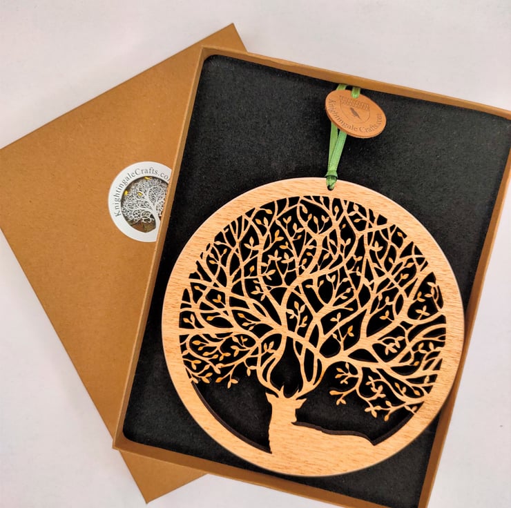 The ornament measures 13.5cm (5 inches) wide by 0.5cm (15 inch) thick and comes packaged in a gift box together with a ribbon attached to the top from which to hang it easily.