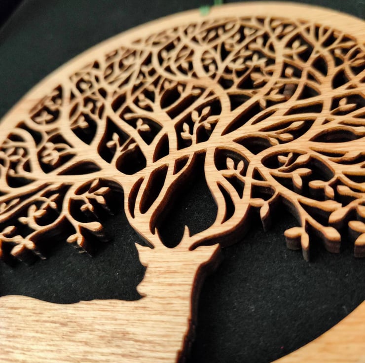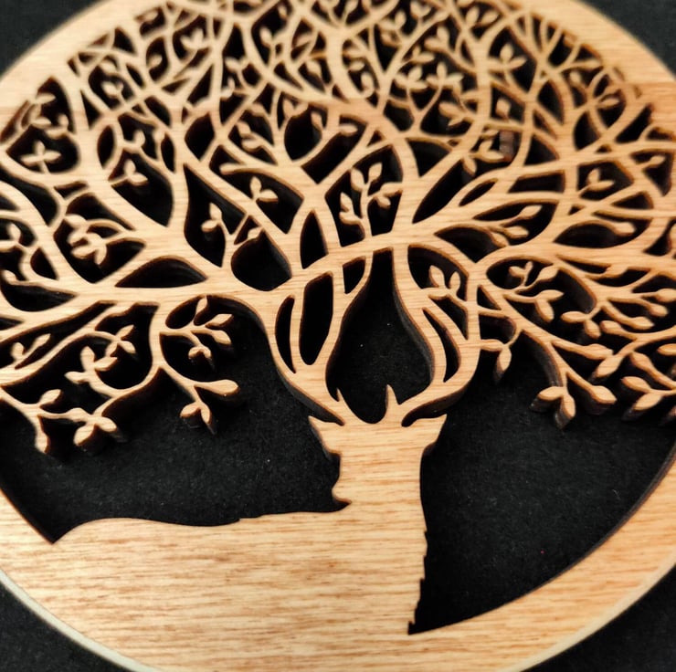 A small and beautiful wooden wall hanging of a magnificent stag with antlers that create an intricate tree design in a circular frame.