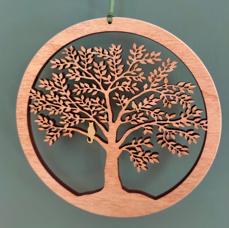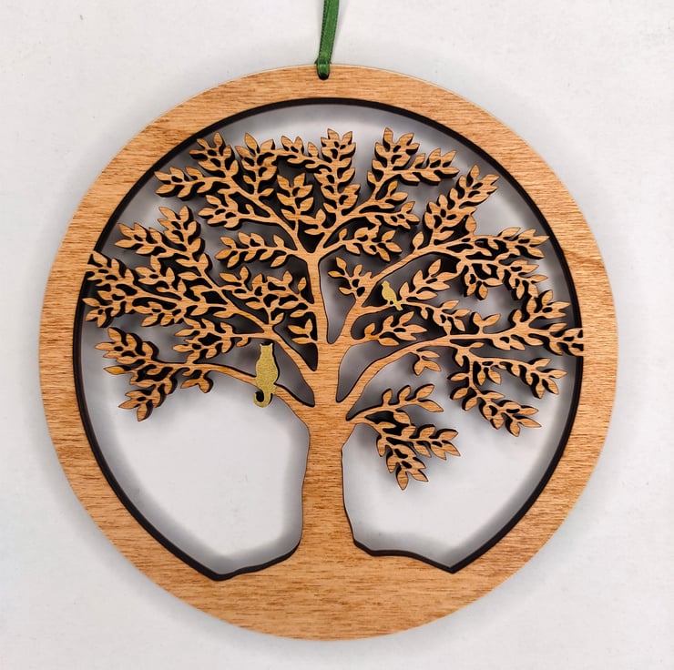 A delightful and highly detailed small wooden hanging of a Tree with a Golden Cat and Bird in it's branches.