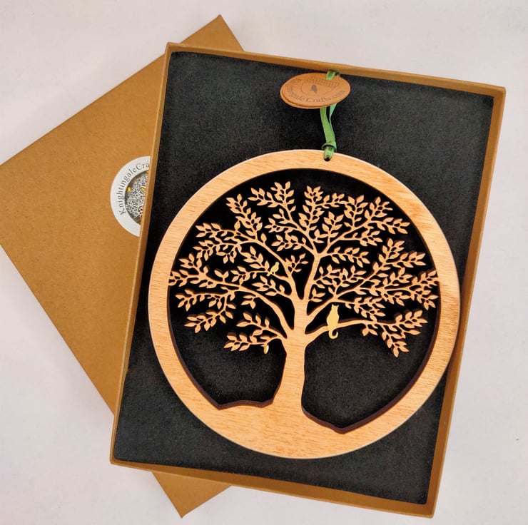 The ornament measures 13.5cm (5 inches) wide by 0.5cm (15 inch) thick and comes packaged in a gift box with a ribbon from which to hang it.
