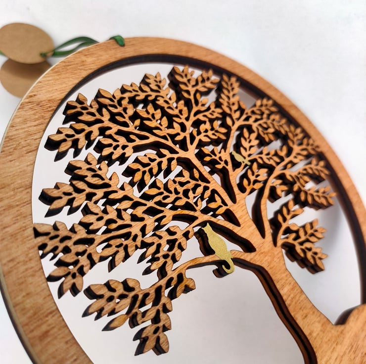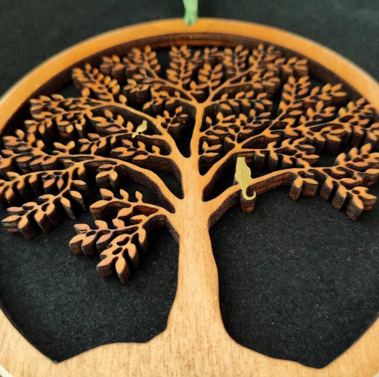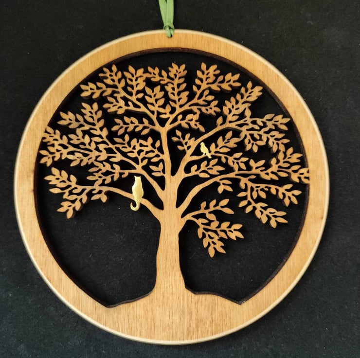 A beautiful wooden hanging of a Tree with a Golden Cat and Bird in it's branches.