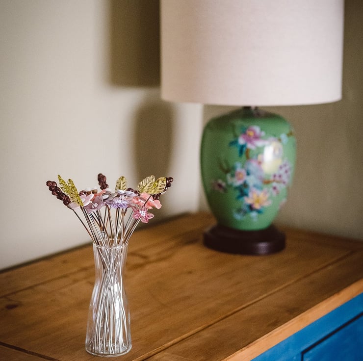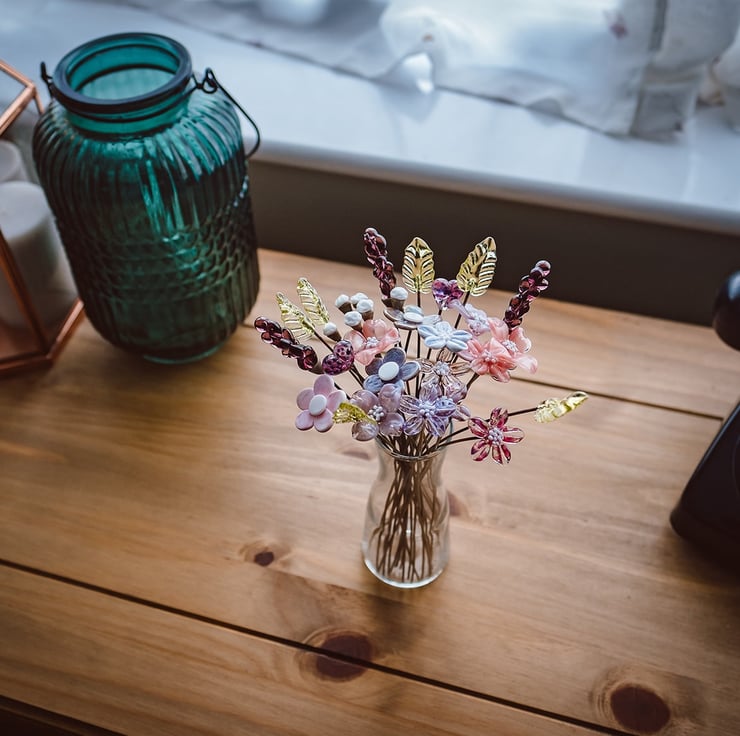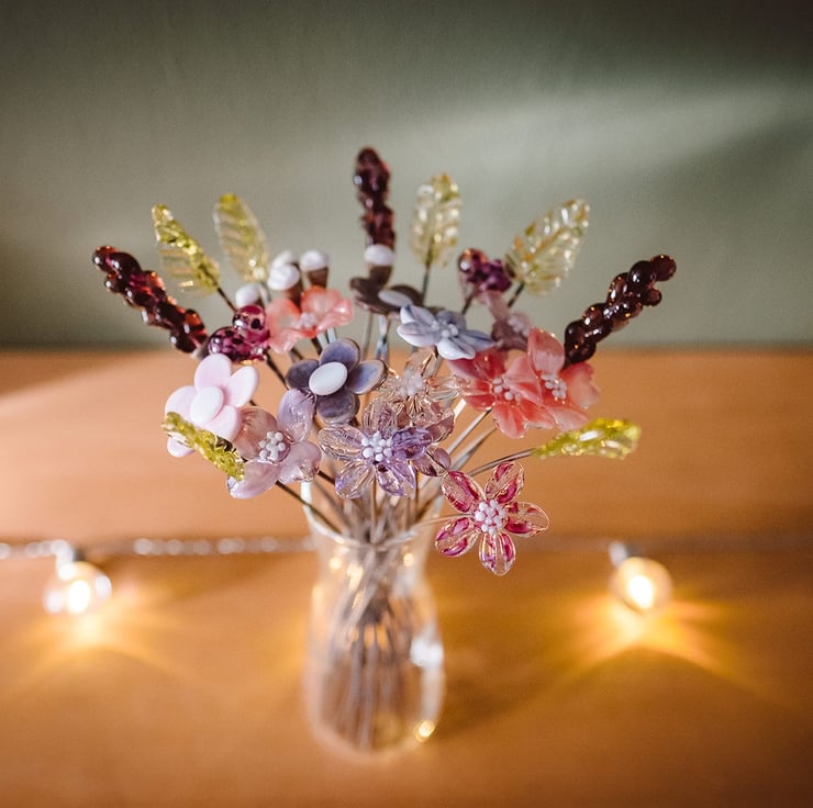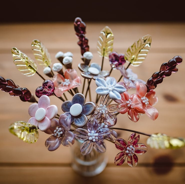 Each flower stem measures approximately 20cm long, with the heads of the flowers varying from 2cm-5cm depending on the style and design. Choose an alternative length of stem for your flowers using the personalisation box below. If nothing is requested, 20cm will be sent out as a default. Every flower is individually handmade, using stainless steel wire and molten glass. Each petal is added, one at a time, shaping the glass to create the perfect bloom before placing it into a kiln to anneal.