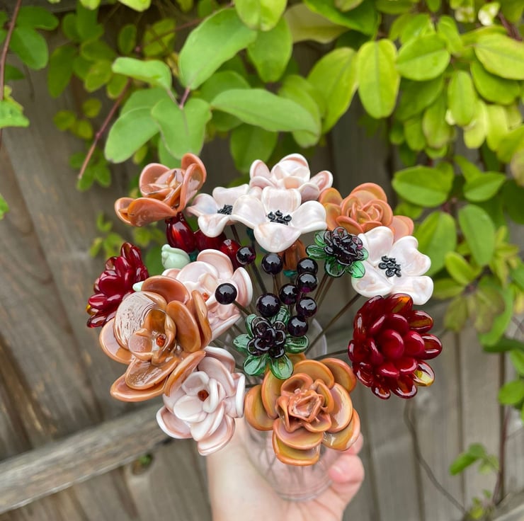 I individually handcraft every petal of each flower from molten glass in a 1200 degree flame. Once complete each stem is fired in a kiln to 'anneal', this strengthens the glass whilst cooling it. The whole process takes around 10 hours from glass rod to beautiful bloom. Checkout the listing video to see a little more of the process.