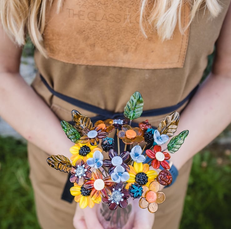 I individually handcraft every petal of each flower from molten glass in a 1200 degree flame. Once complete each stem is fired in a kiln to 'anneal', this strengthens the glass whilst cooling it. The whole process takes around 10 hours from glass rod to beautiful bloom. Checkout the listing video to see a little more of the process.