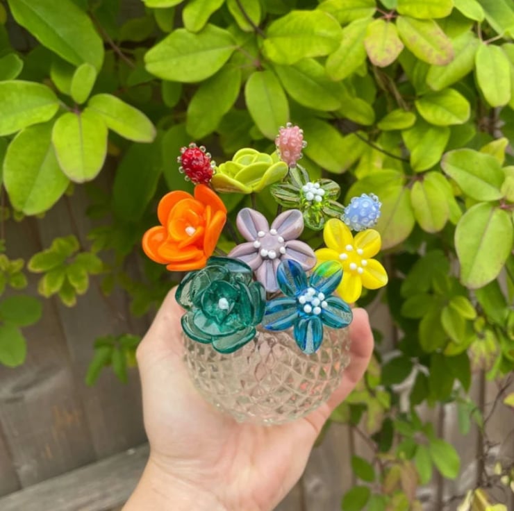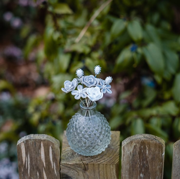 Each flower stem measures approximately 8-10cm long, with the heads of the flowers varying from 2cm-5cm depending on the style and design. Every flower is individually handmade, using stainless steel wire and molten glass. Each petal is added, one at a time, shaping the glass to create the perfect bloom before placing it into a kiln to anneal.