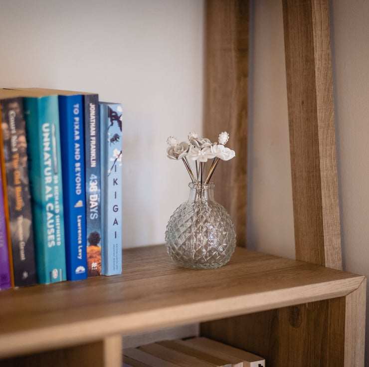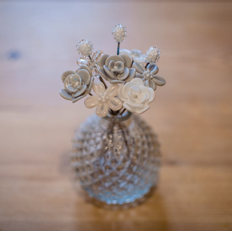 This vase is comprised of 4 beautiful flowers, 3 roses, and 3 seed stems all in shades of white, clear and grey. Other colour way options are available, please select below.
