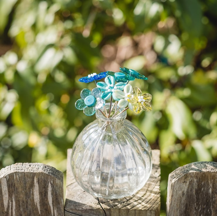 Each flower stem measures approximately 12cm long, with the heads of the flowers varying from 2cm-3cm depending on the style and design. Every flower is individually handmade, using stainless steel wire and molten glass. Each petal is added, one at a time, shaping the glass to create the perfect bloom before placing it into a kiln to anneal.