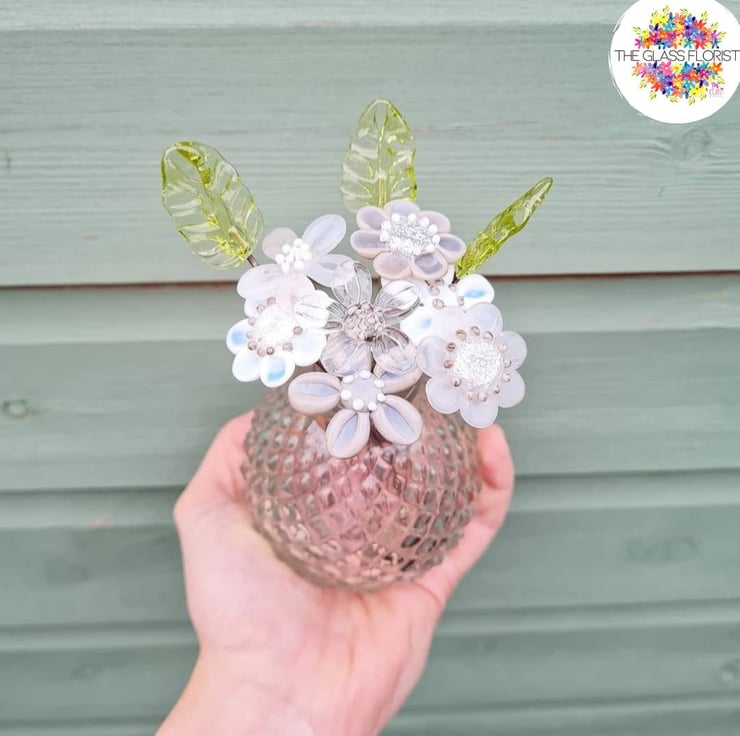 Each flower stem measures approximately 8-10cm long, with the heads of the flowers varying from 2cm-5cm depending on the style and design. Every flower is individually handmade, using stainless steel wire and molten glass. Each petal is added, one at a time, shaping the glass to create the perfect bloom before placing it into a kiln to anneal.