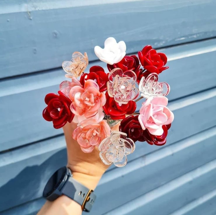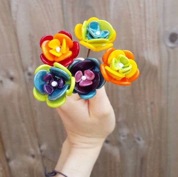 I individually handcraft every petal of each flower from molten glass in a 1200 degree flame. Once complete each stem is fired in a kiln to 'anneal', this strengthens the glass whilst cooling it. The whole process takes around 10 hours from glass rod to beautiful bloom. Checkout the listing video to see a little more of the process.