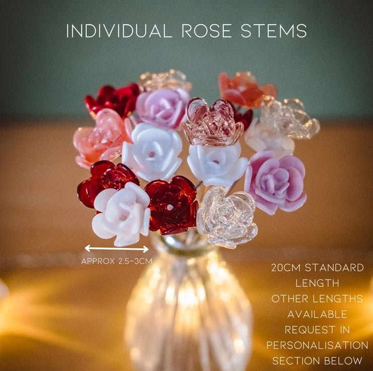 Choose beauty that never fades with a gorgeous handcrafted glass rose stem, made with any colour you wish from the colour chart.