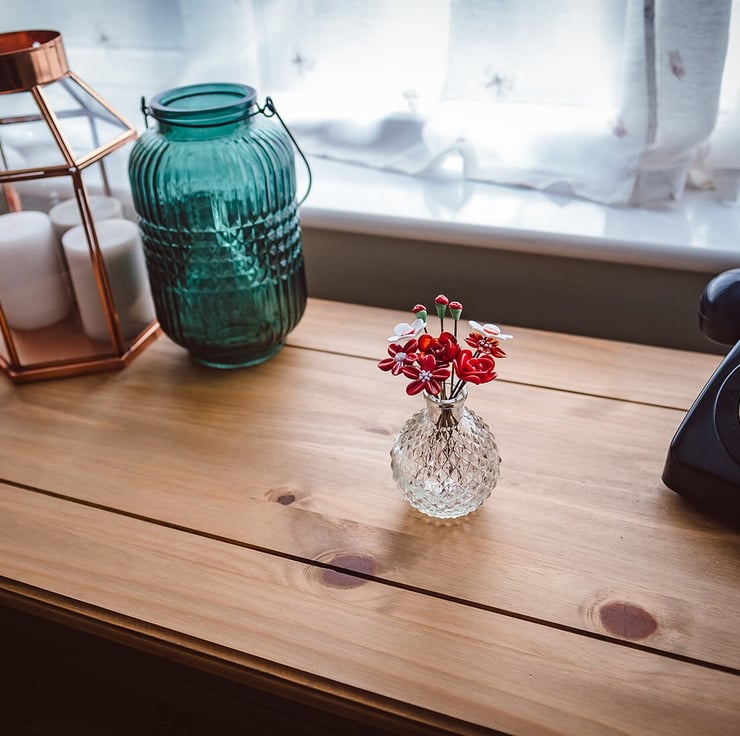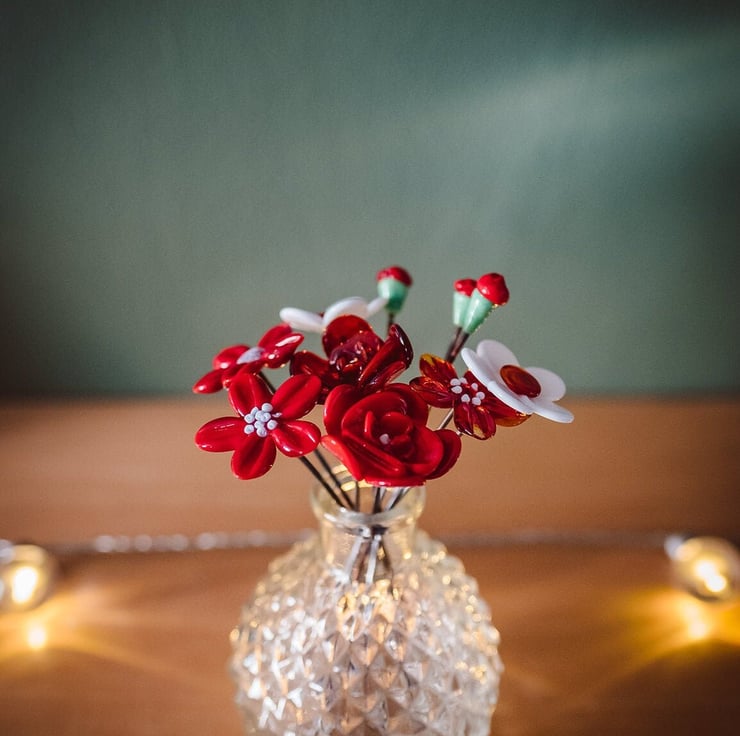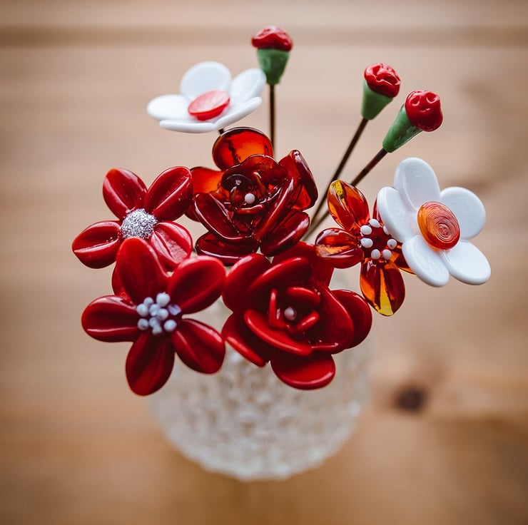Each flower stem measures approximately 8-10cm long, with the heads of the flowers varying from 2cm-5cm depending on the style and design. Every flower is individually handmade, using stainless steel wire and molten glass. Each petal is added, one at a time, shaping the glass to create the perfect bloom before placing it into a kiln to anneal.