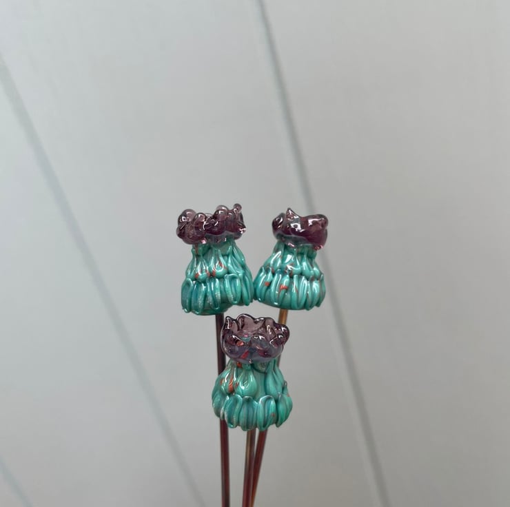 I individually handcraft every petal of each flower from molten glass in a 1200 degree flame. Once complete each stem is fired in a kiln to 'anneal', this strengthens the glass whilst cooling it. The whole process takes around 10 hours from glass rod to beautiful bloom. Checkout the listing video to see a little more of the process.
