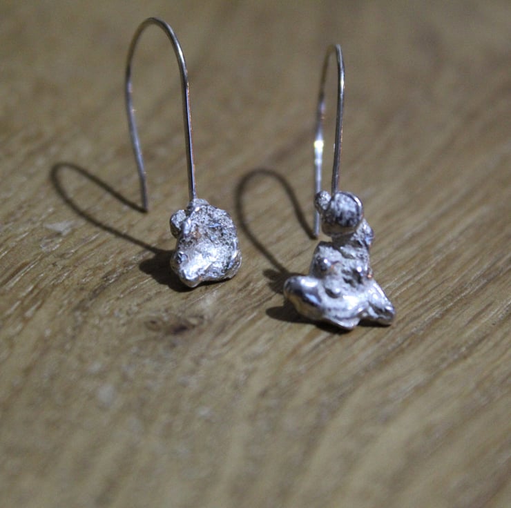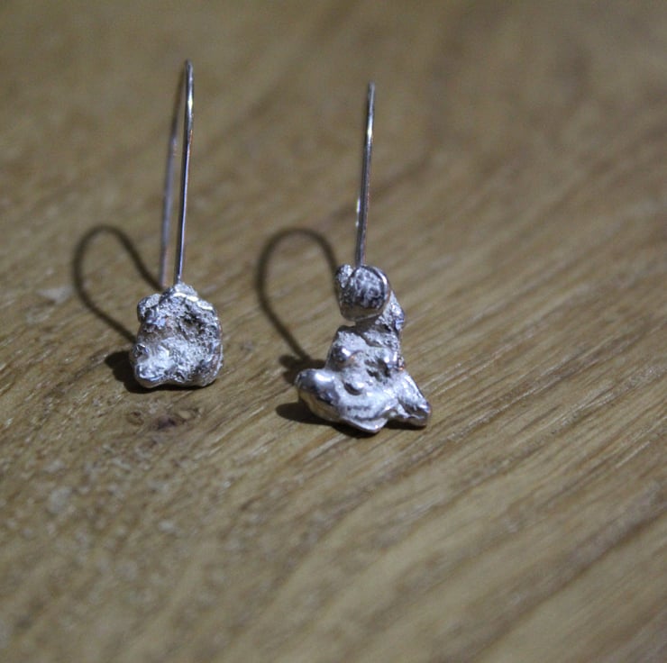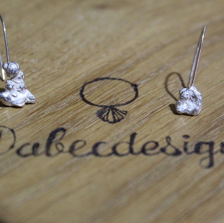 My recycled range is handcrafted using scraps from my silversmithing and some silver that my husband found on the beach with his metal detector. I then used water and broom casting to form the unique pieces of jewellery. With these techniques the result is completely organic so all products have been named based on what we think they look like which has led to some unusual titles! Obviously you may see something different.
