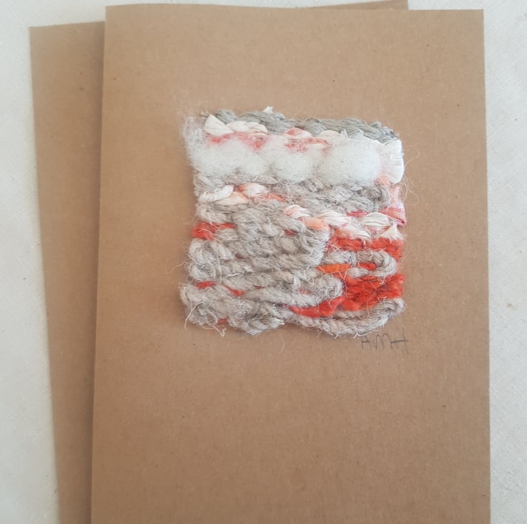 Individually designed handmade card with a 'mini' weaving that has been hand woven using natural wool fibres, pure cotton cord, yarn containg cotton, viscose and silk, and recycled silk fabric, mounted on a buff card.