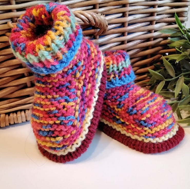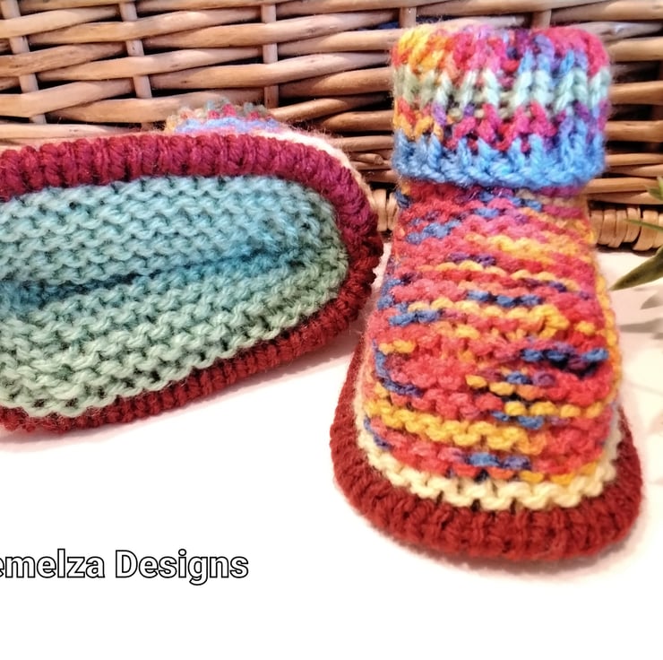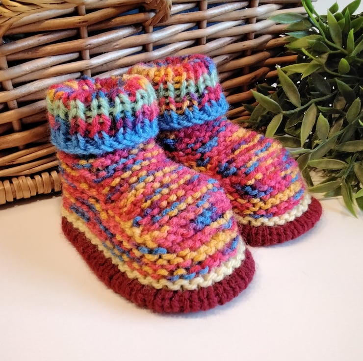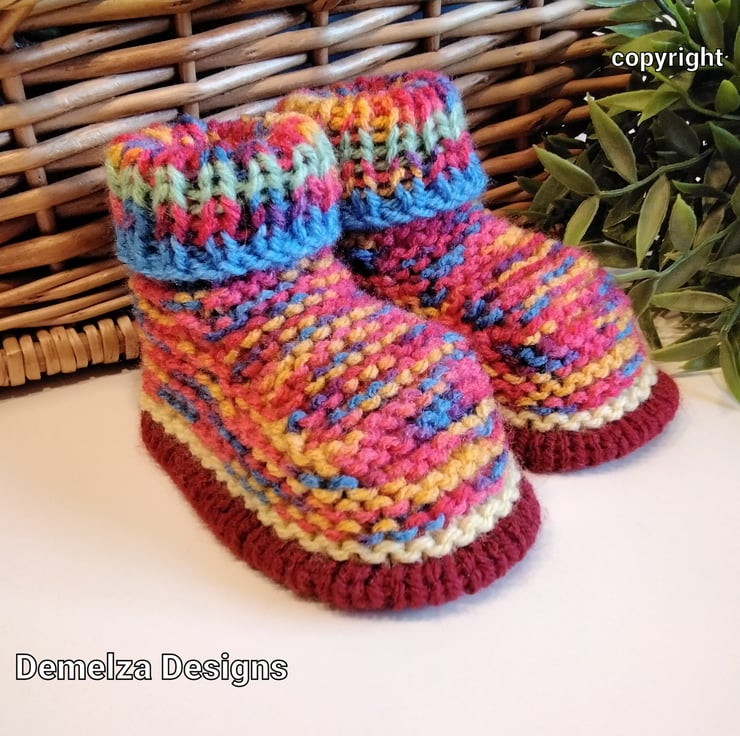 A sweet practical pair of cosy warm booties ideal for everyday wear when out and about in the stroller or car seat. They have been lovingly designed and hand crafted using quality branded British premium machine washable yarns.