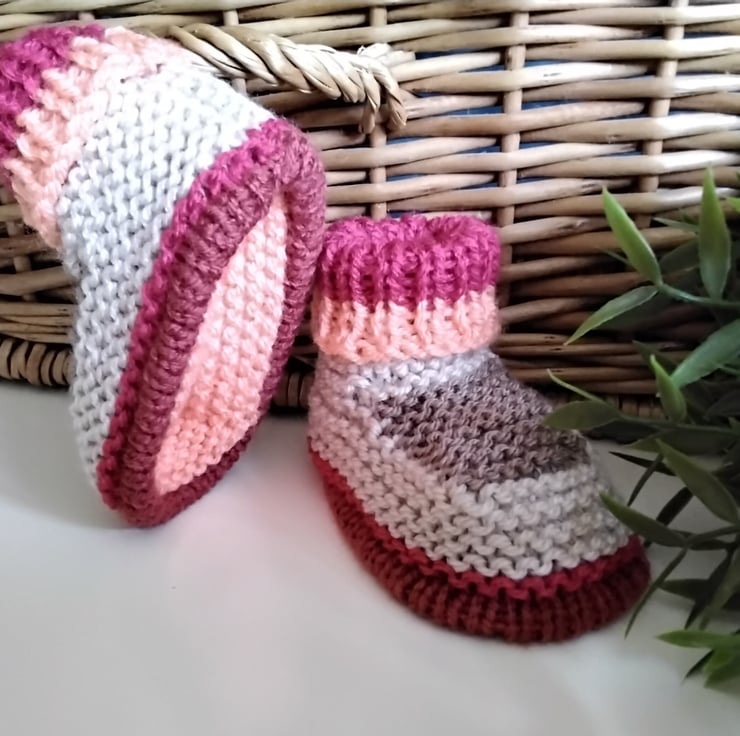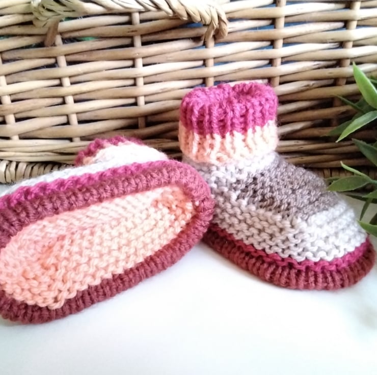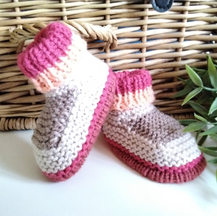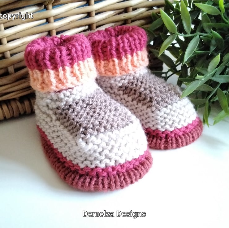 A sweet practical pair of cosy warm booties ideal for everyday wear when out and about in the stroller or car seat. They have been lovingly designed and hand crafted using quality branded British premium machine washable yarns.